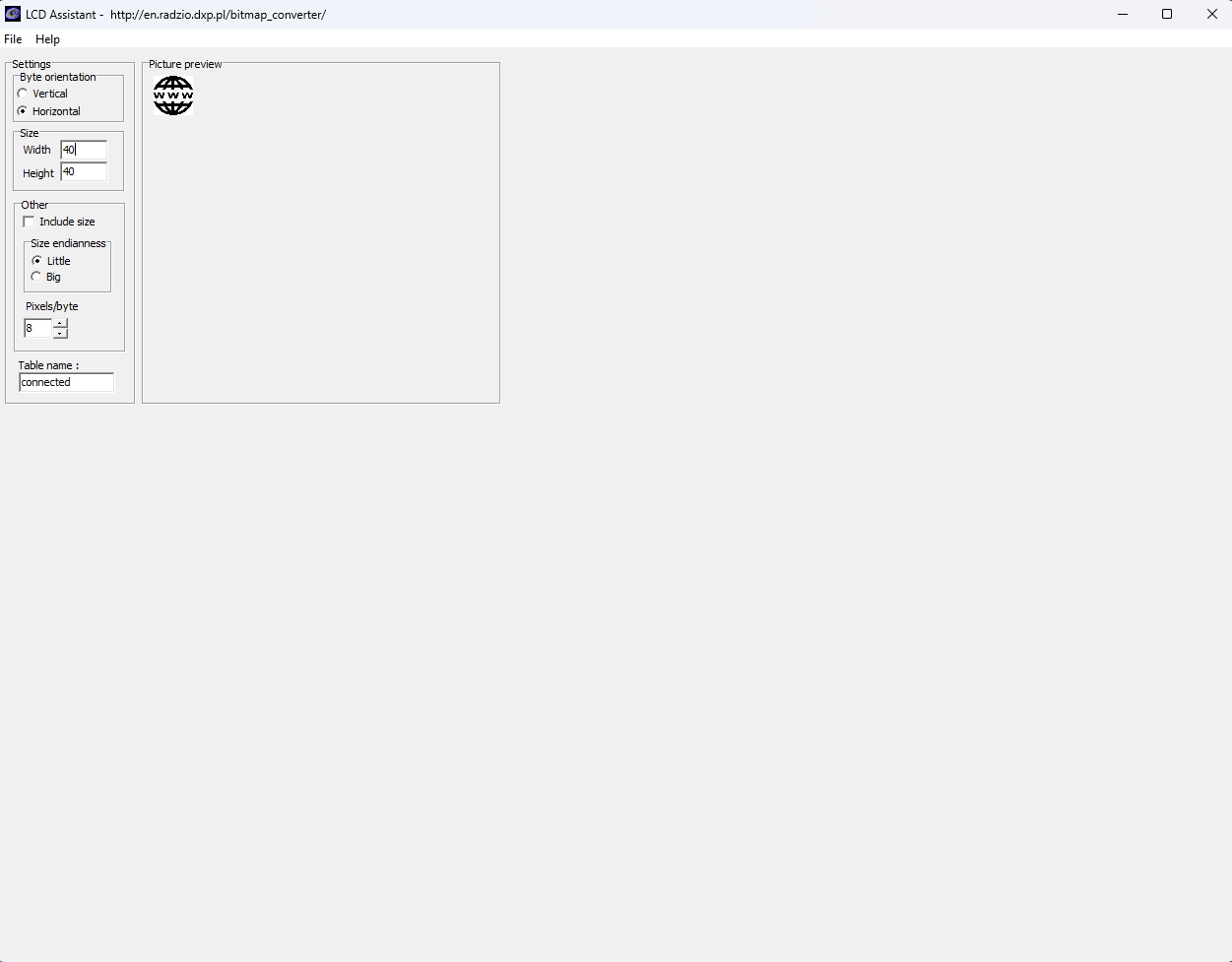 :hash: To be able to display images (icons) on the SSD1306 OLED screen, first convert image files (PNG or JPG) to monochromatic bitmaps. Then, convert the generated bitmaps to compatible C data arrays. I decided to utilize LCD Assistant to create C data arrays. :hash: After installing LCD Assistant, upload a monochromatic bitmap and select Vertical or Horizontal, depending on the screen type. :hash: Then, save all the converted C data arrays to the logo.h file. ⭐ In the logo.h file, I defined multi-dimensional arrays to group the assigned logos (interface and class) and their sizes — width and height.