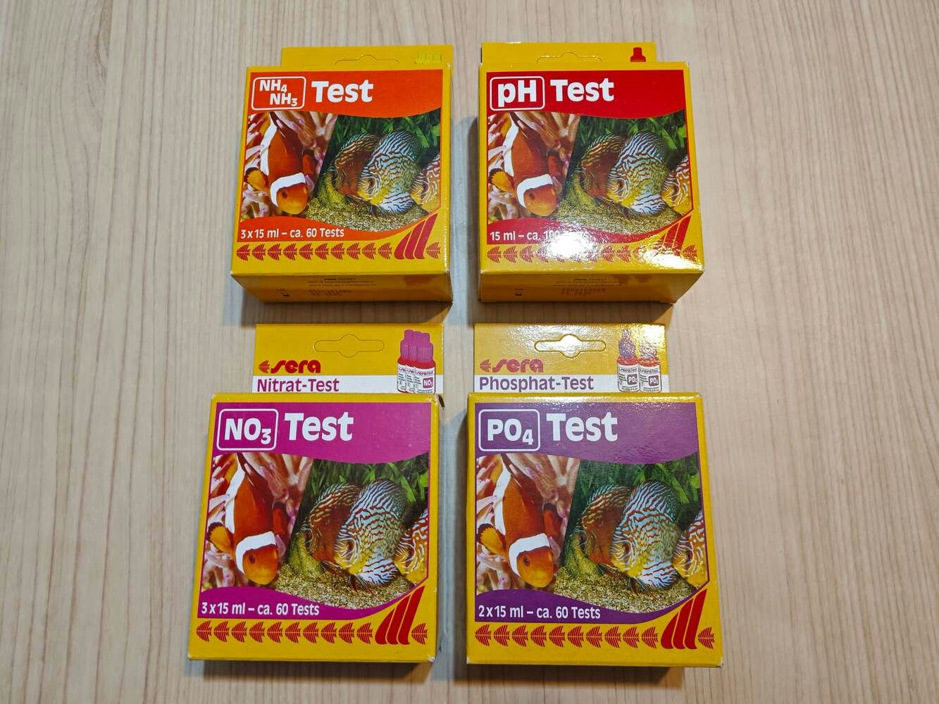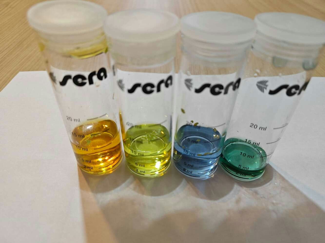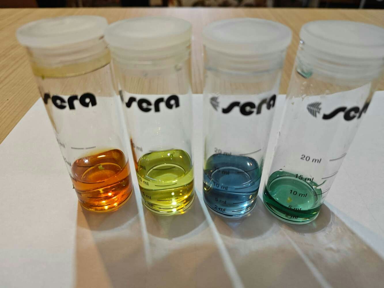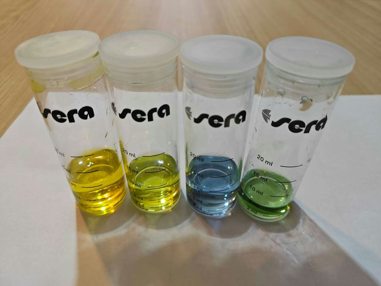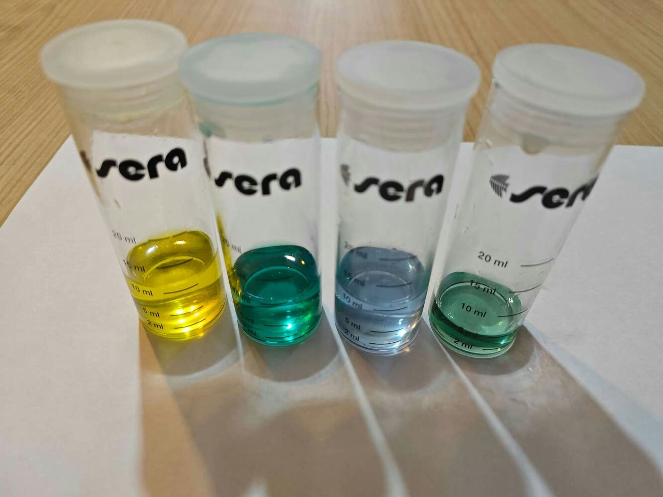 Since all underwater air bubble activity cannot be singled out as an imminent toxic pollution risk, I decided to enable this air bubble detection device with the ability to assess potential water pollution based on chemical water quality tests. Even though there are various water quality tests for fish tanks, I decided to utilize color-coded chemical tests produced by the renowned full-range supplier for aquariums, ponds, and terrariums — sera. In this regard, I was able to make the object detection model determine the water pollution levels easily by the color discrepancies of the applied water quality tests. After researching the most common indicators of water pollution in a retail fish farm, in this case, my overpopulated medium-sized aquarium simulating harsh fish farm conditions, I decided to apply these four water quality tests regularly: