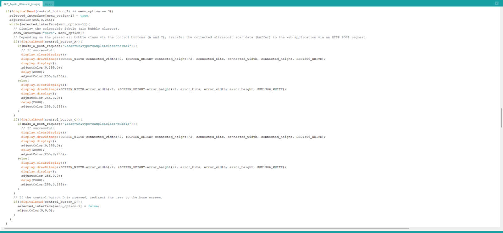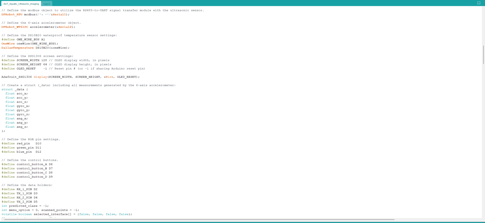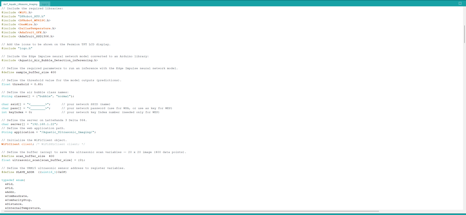 After setting Nano ESP32 on the Arduino IDE, I programmed Nano ESP32 to initiate an aquatic ultrasonic scan, generate an ultrasonic scan data buffer according to the movements detected by the accelerometer, and transfer the generated ultrasonic scan buffer to the web application via an HTTP POST request. Since I wanted to provide a feature-rich user interface allowing the user to assign labels while collecting data samples, I decided to connect the SSD1306 OLED display and four control buttons to Nano ESP32. Via the user interface, I was able to assign air bubble classes empirically and send the generated ultrasonic scan buffer with the selected air bubble class (label) directly to the web application. As mentioned earlier, Nano ESP32 does not provide an onboard storage option. Thus, by transferring samples to the web application, I obviated the need for connecting external storage to Nano ESP32. Since Nano ESP32 features three hardware serial (UART) ports, excluding the USB serial port, I was able to connect multiple sensors requiring serial communication without a data transmission conflict. As explained in the previous steps, the web application sorts the transferred data packet to save ultrasonic scan samples as text files named according to the assigned classes. This AI-powered underwater air bubble detection device comprises two separate development boards — Nano ESP32 and UNIHIKER — performing interconnected features for data collection and running advanced AI models. Thus, the described code snippets show the different aspects of the same code file. Please refer to the code files below to inspect all interconnected functions in detail. 📁 AIoT_Aquatic_Ultrasonic_Imaging.ino ⭐ Include the required libraries.