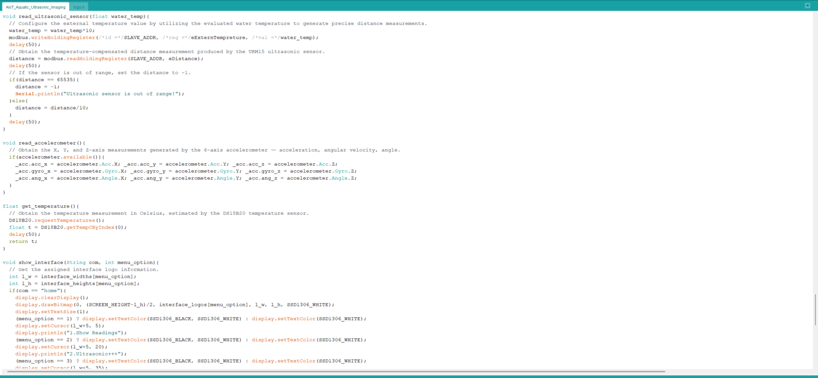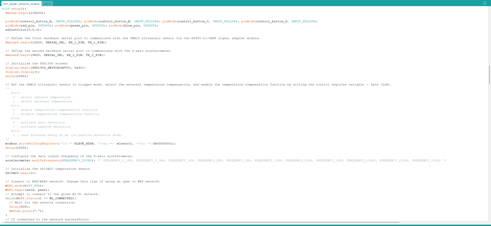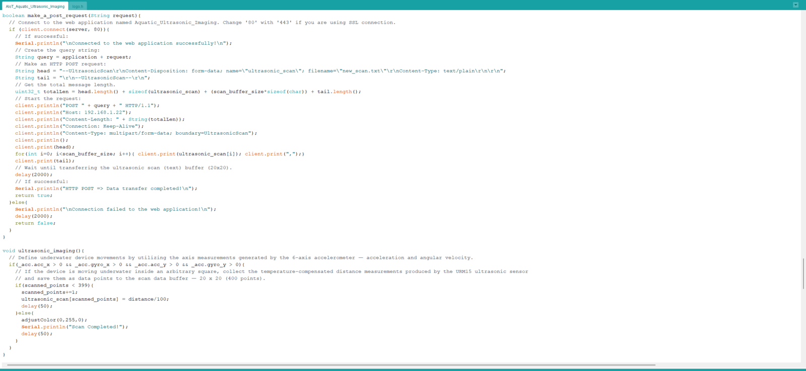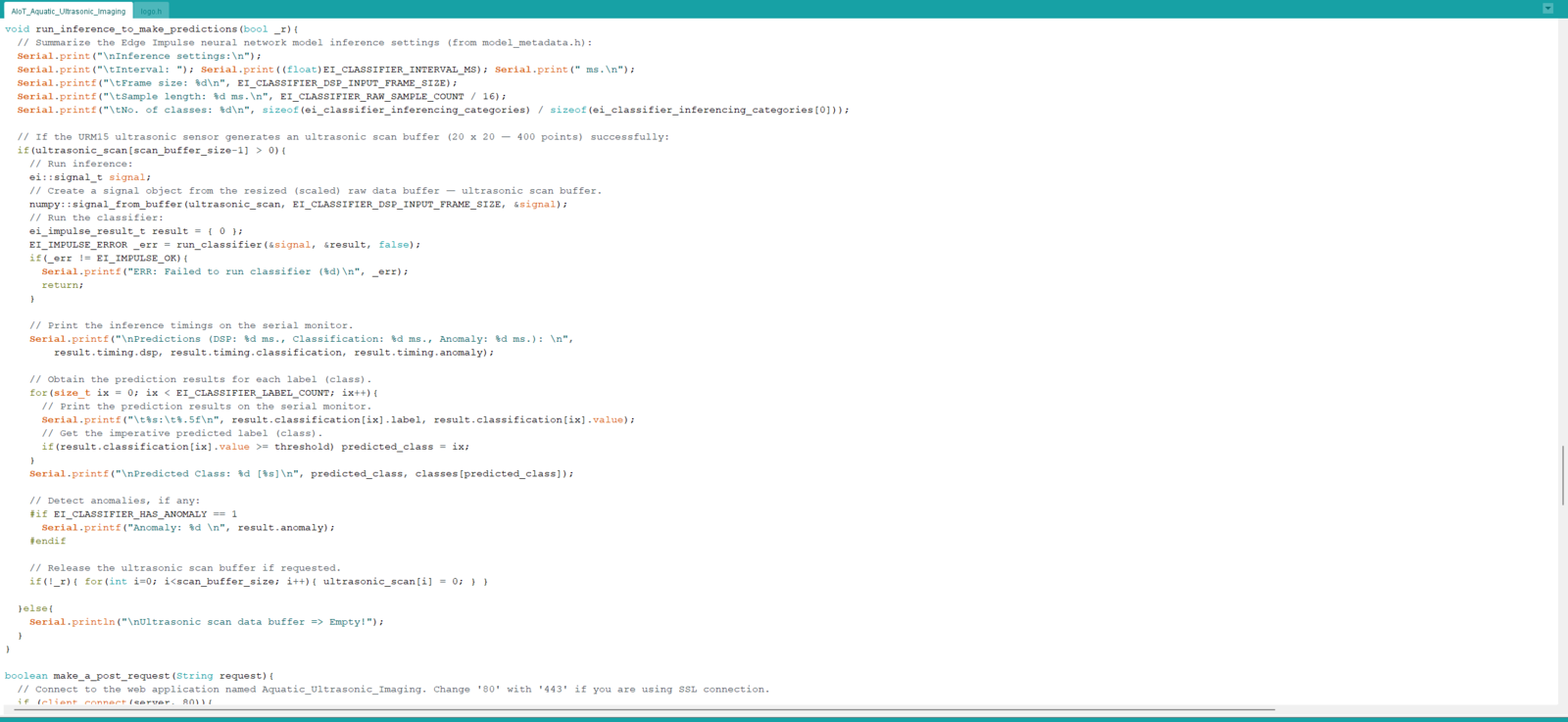 After setting Nano ESP32 on the Arduino IDE, I programmed Nano ESP32 to initiate an aquatic ultrasonic scan, generate an ultrasonic scan data buffer according to the movements detected by the accelerometer, and transfer the generated ultrasonic scan buffer to the web application via an HTTP POST request. Since I wanted to provide a feature-rich user interface allowing the user to assign labels while collecting data samples, I decided to connect the SSD1306 OLED display and four control buttons to Nano ESP32. Via the user interface, I was able to assign air bubble classes empirically and send the generated ultrasonic scan buffer with the selected air bubble class (label) directly to the web application. As mentioned earlier, Nano ESP32 does not provide an onboard storage option. Thus, by transferring samples to the web application, I obviated the need for connecting external storage to Nano ESP32. Since Nano ESP32 features three hardware serial (UART) ports, excluding the USB serial port, I was able to connect multiple sensors requiring serial communication without a data transmission conflict. As explained in the previous steps, the web application sorts the transferred data packet to save ultrasonic scan samples as text files named according to the assigned classes. This AI-powered underwater air bubble detection device comprises two separate development boards — Nano ESP32 and UNIHIKER — performing interconnected features for data collection and running advanced AI models. Thus, the described code snippets show the different aspects of the same code file. Please refer to the code files below to inspect all interconnected functions in detail. 📁 AIoT_Aquatic_Ultrasonic_Imaging.ino ⭐ Include the required libraries.