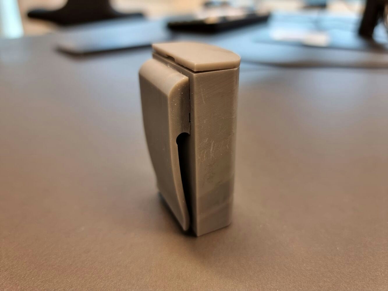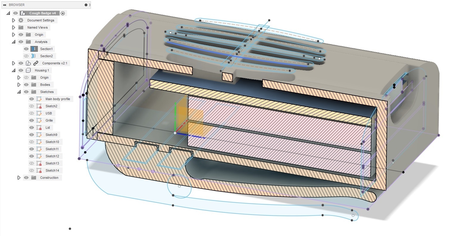 I wanted to make a prototype for demonstrating the concept for clinicians. It needed to contain and protect the electronics and batteries, while allowing sound waves to reach the microphone. I realized this would complicate making the enclosure watertight and quickly crossed that off the list. I also wanted to make a practical mechanism for securing the device on the wearer. I used Autodesk Fusion 360 as CAD to design the enclosure. I always start by making rough digital replications of the hardware using calipers to take measurements on a sketch.