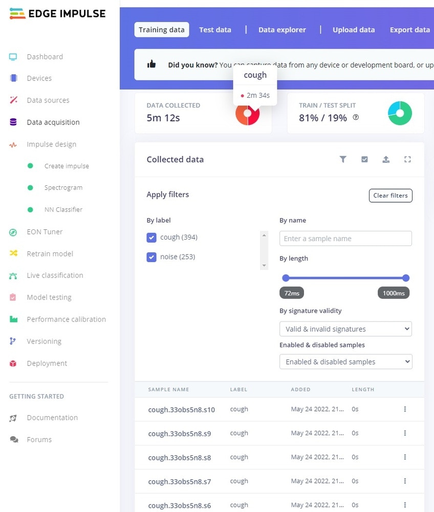 Edge Impulse is the leading development platform for machine learning on edge devices and it’s free for use by developers. The documentation is some of the best I have experienced in my two decades as a professional developer. I also wish to recommend the book TinyML Cookbook by Gian Marco Iodice as a practical, project based introduction to TinyML and Edge Impulse. I will highlight some particulars of my application. You may explore my project here. A model was trained using 394 labeled audio samples of intense coughs, a total of 2 minutes and 34 seconds. An almost equal amount of audio samples of less intense coughs, sneezes, clearing of throat, speech and general sounds was also labeled, 253 samples, 2 minutes and 38 seconds. All samples were captured using the Arduino Nano, positioned at the intended spot for wear.