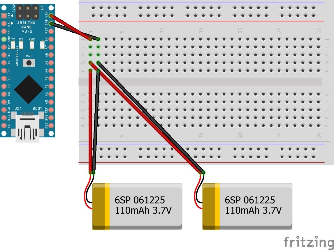 I used lithium polymer batteries for compact size and ease of recharging. I only had spare 500 mAh batteries available, shipping options for assorted batteries by air is limited. To extend battery life I connected two in parallel by soldering 3 JSH female connectors. Warning: This wiring is subjectable to short circuit and is only connected under supervision. This gives twice the capacity while keeping the voltage at the same level.