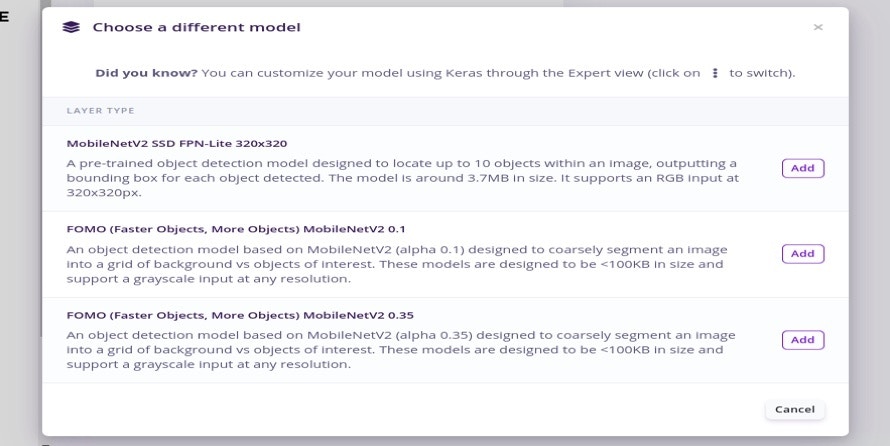 The FOMO algorithm provides a variant in between; a simplified version of object detection that is suitable for many use cases where the position of the objects in the image is needed, but when a large or complex model cannot be used due to resource constraints on the device. FOMO (Faster Objects, More Objects) is a brand-new approach to run object detection models on constrained devices. FOMO is a ground-breaking algorithm that brings real-time object detection, tracking and counting to microcontrollers for the first time. FOMO is 30x faster than MobileNet SSD and can run in <200K of RAM. To configure FOMO, head over to the ‘Object detection’ section, and select ‘Choose a different model’ then select one of the FOMO models as shown in the image below.