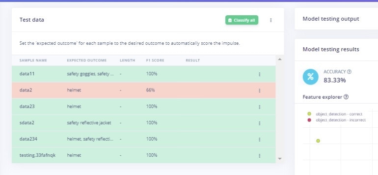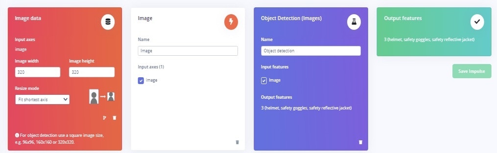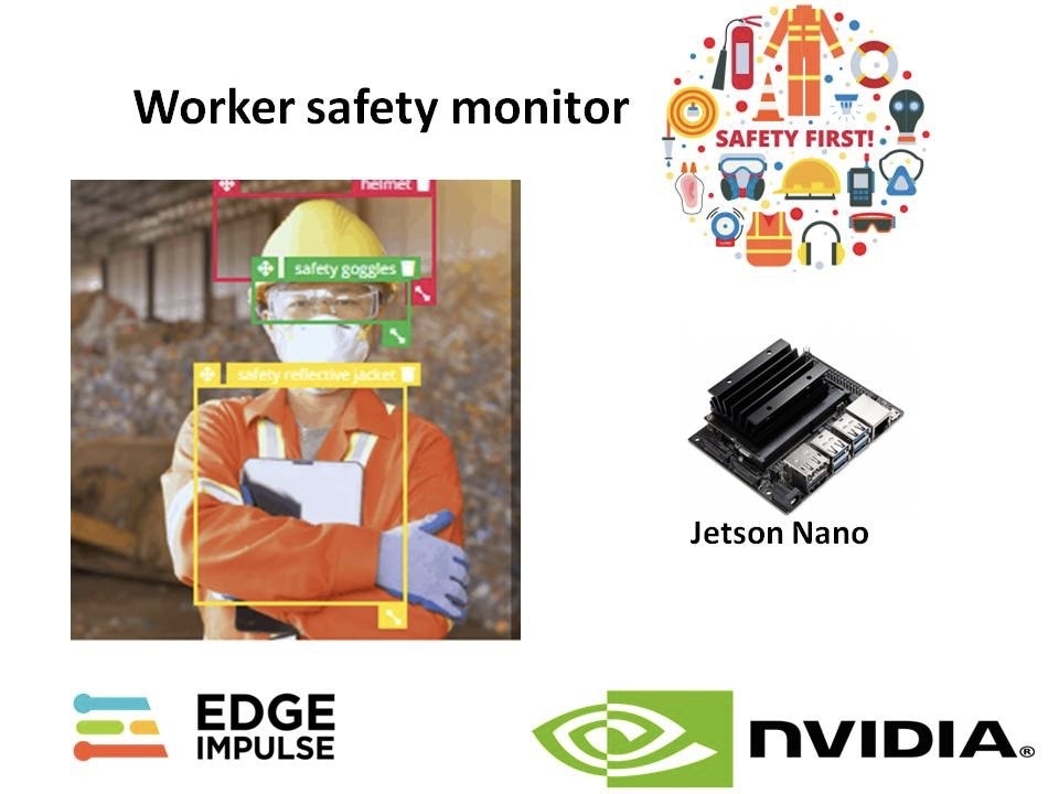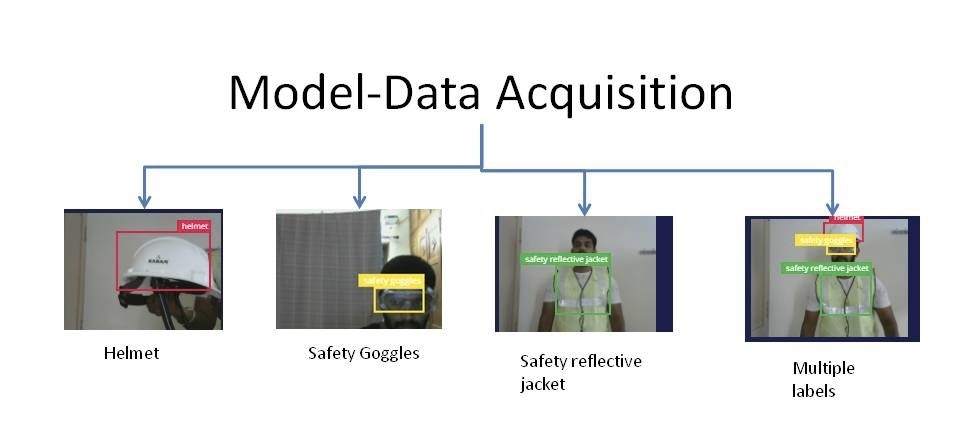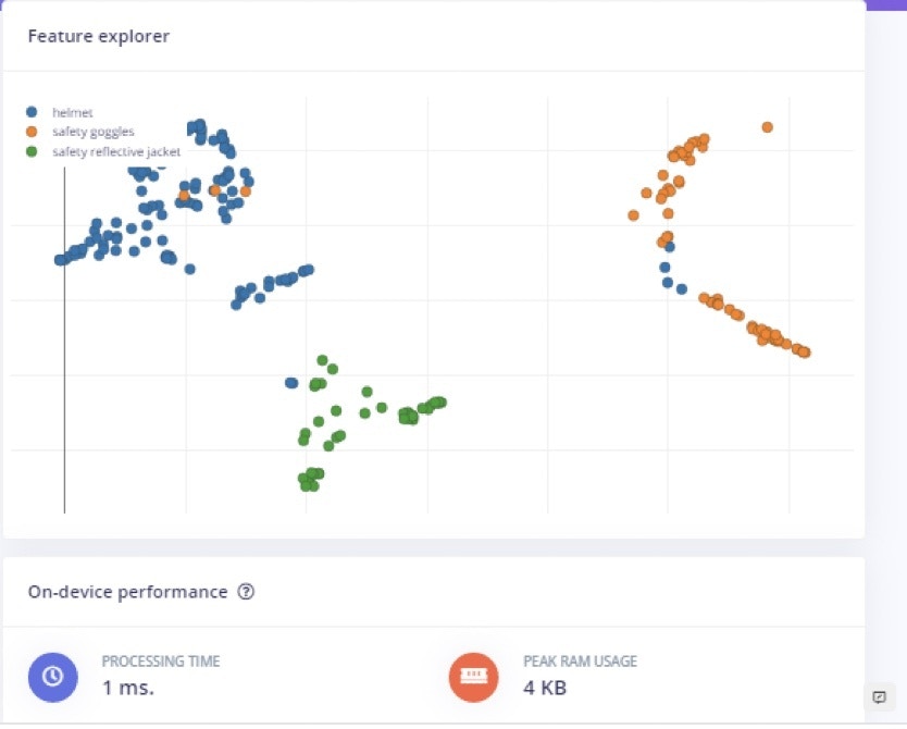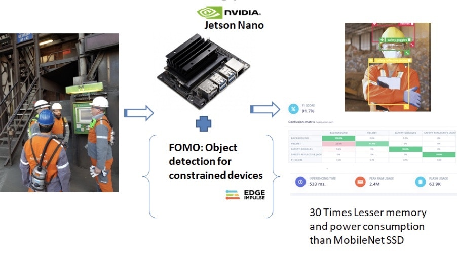 In this prototype model, an Nvidia Jetson Nano and web camera are used. For model training, the FOMO (Faster Objects, More Objects) algorithm developed by Edge Impulse is used. For data acquisition, three objects are labeled in an image – Helmet, Safety Goggles, and Safety Reflective Jacket.