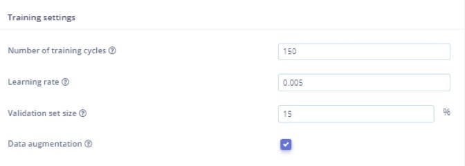In Model training, I have selected FOMO (Faster Objects, More Objects) MobileNetV2 0.35 with training cycles set to 150, and Learning rate as 0.005.