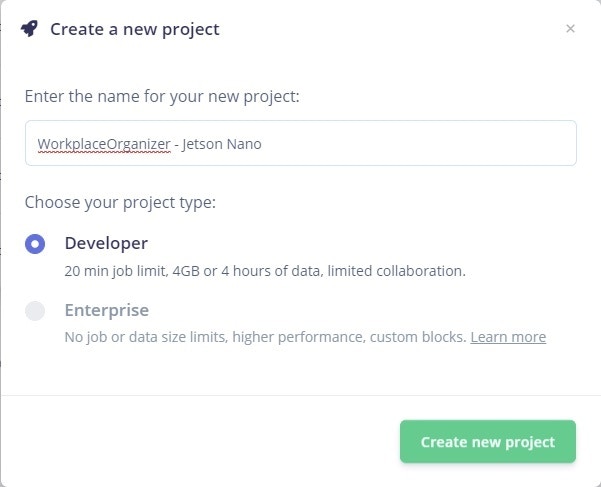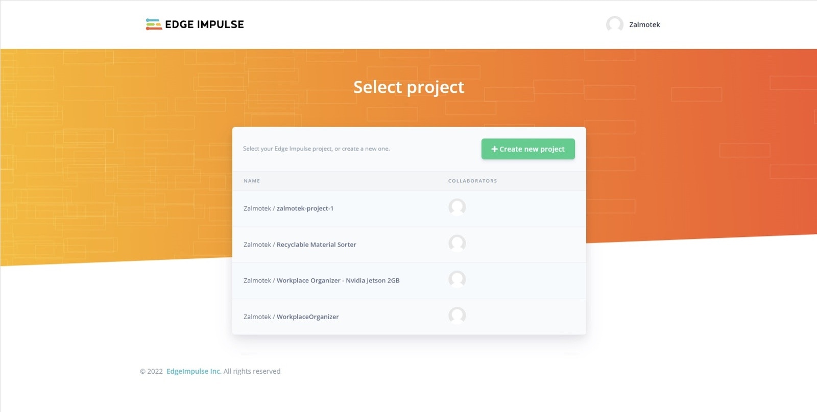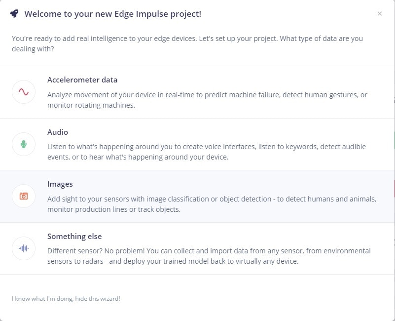 The first step towards building your TinyML Model is creating a new Edge Impulse Project. Once logged in to your Edge Impulse account, you will be greeted by the Project Creation screen.