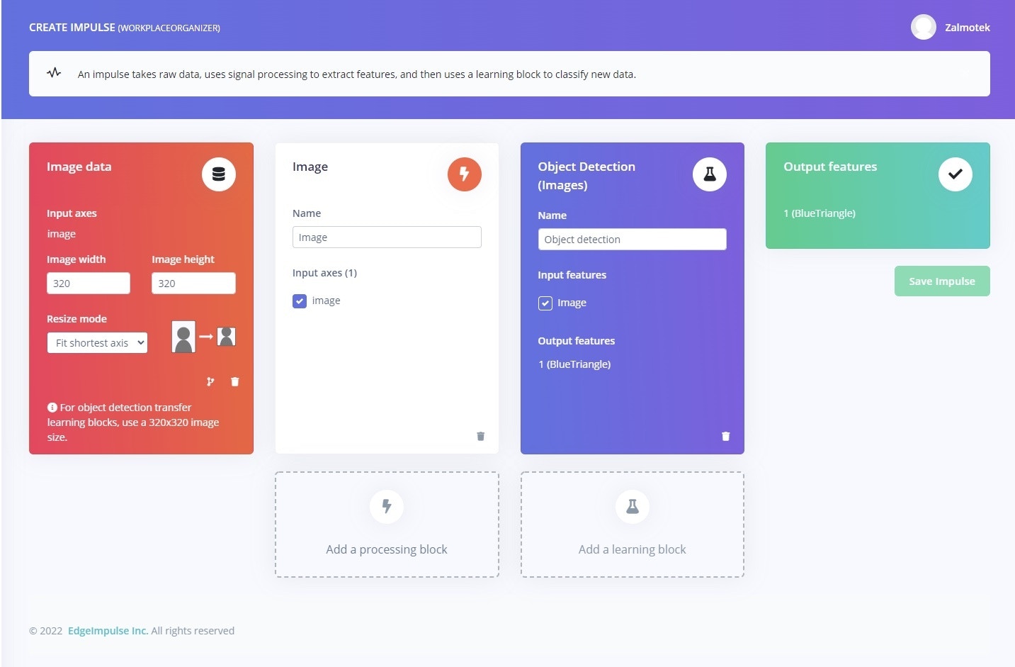 After all the labeling is done, click on Create Impulse, under the Impulse design panel. For the input block, select Images as input, select image as processing block, and Object detection as learning block.