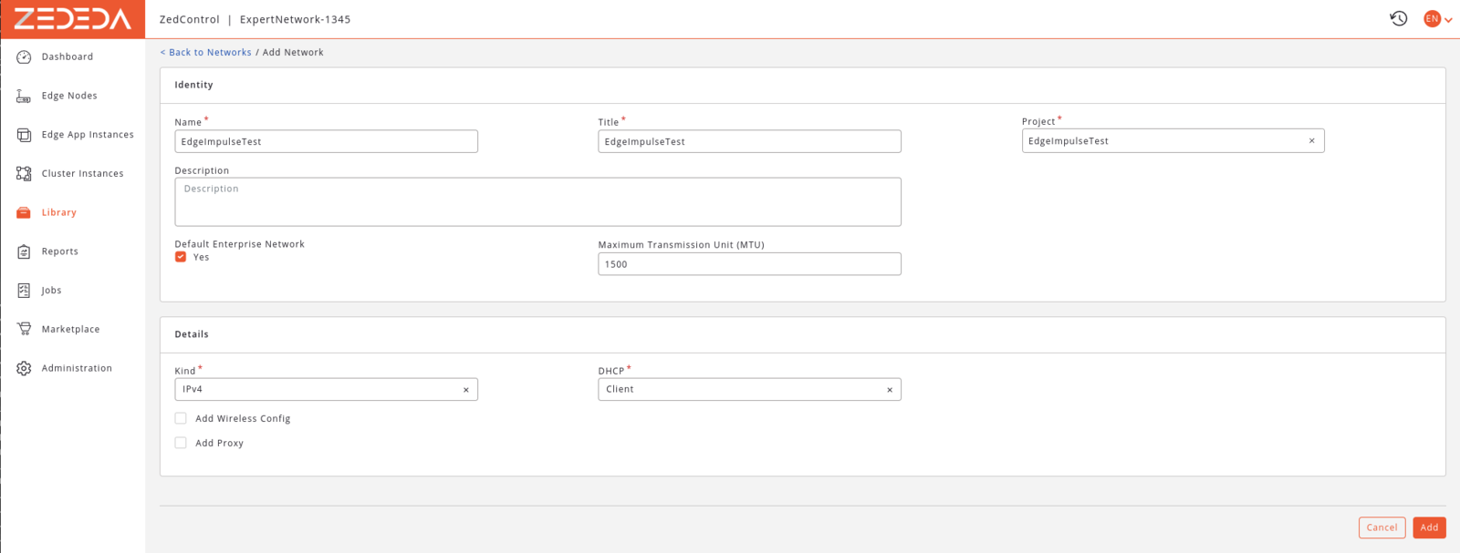 Before being able to onboard the Raspberry Pi 4 we will need to configure a network for the Edge Nodes to use. For this go to Library -> Networks and click Add Network.