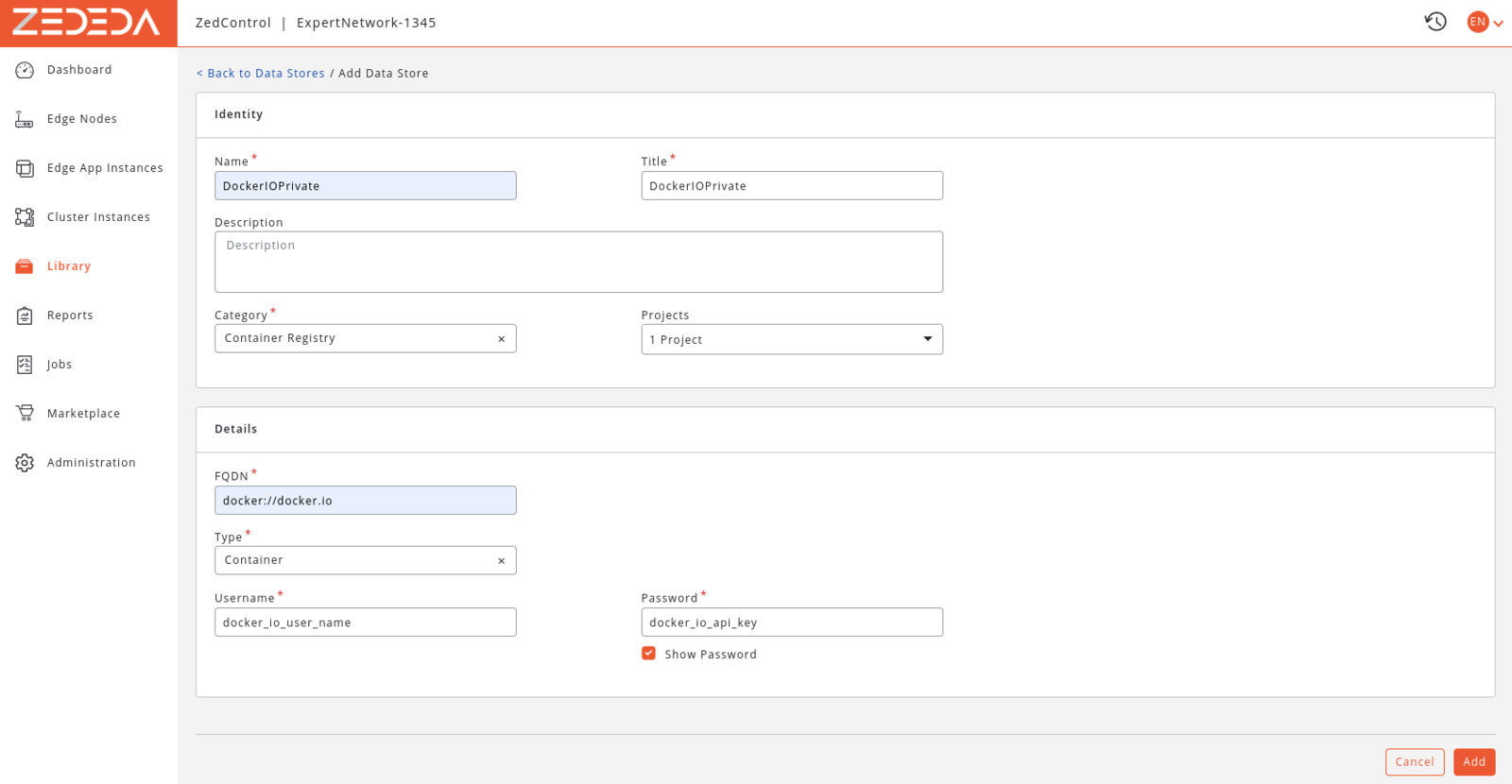As we will use a slightly modified container image, we will need a container registry that we can attach to ZEDEDA Cloud. To attach a container registry to ZEDEDA Cloud, go to Library -> Data Stores, and hit+