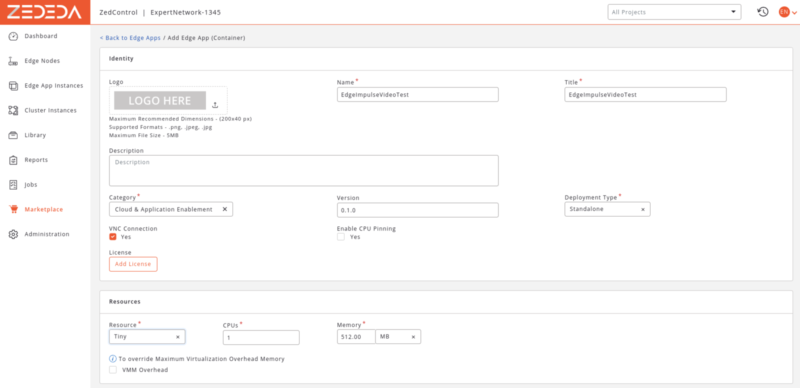 In this section we will show how we can deploy Edge Impulse models as an Edge App into the ZEDEDA platform. EVE OS and the ZEDEDA platform supports running applications based either on Containers or Virtual Machines (VM). In this project we will build and deploy our Edge Impulse model as a Container-based Edge App.Preparing a Container Image