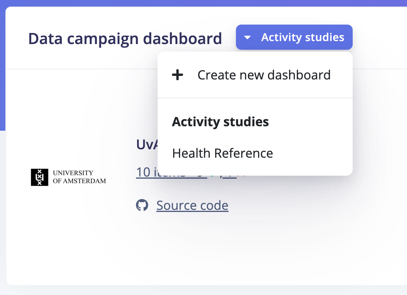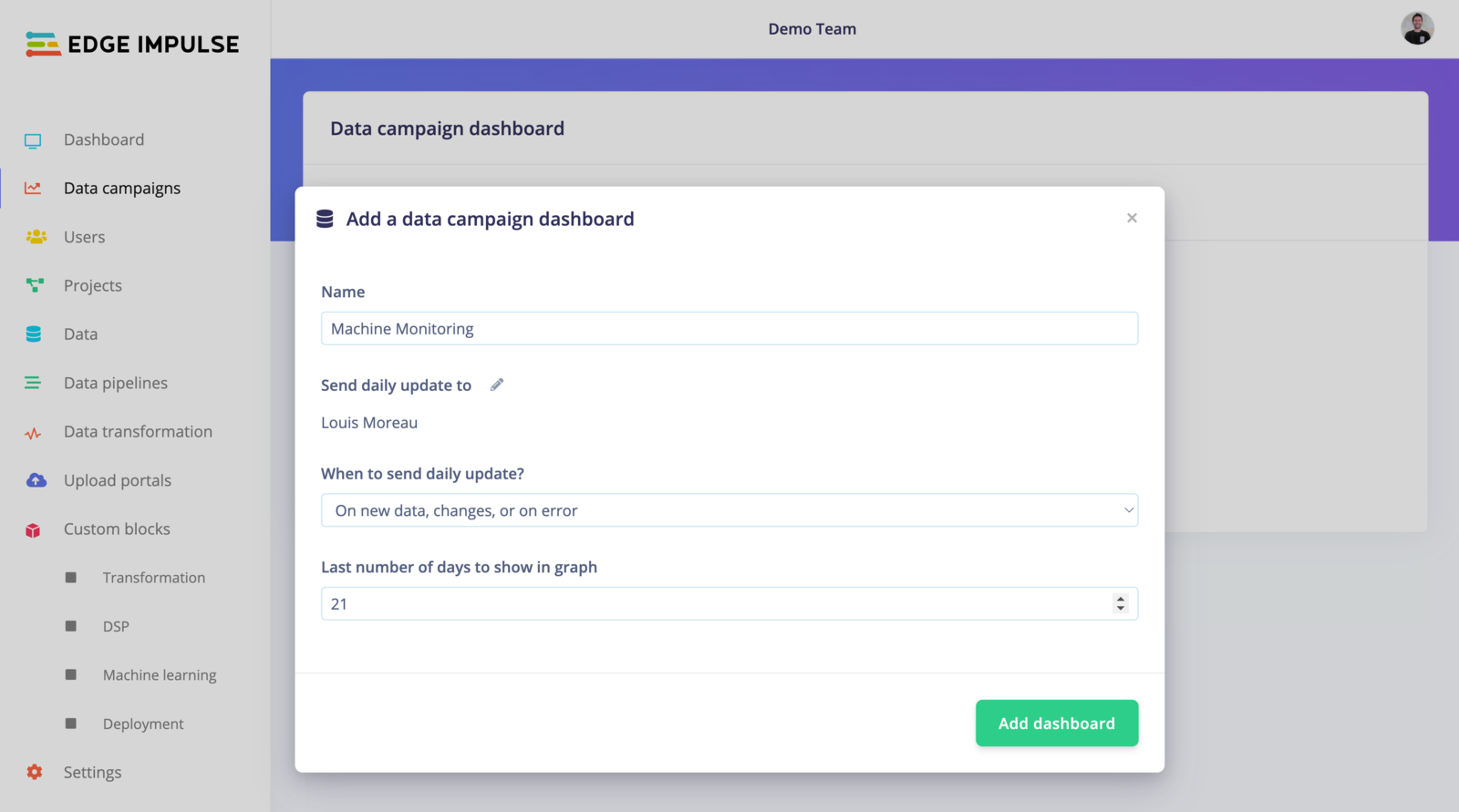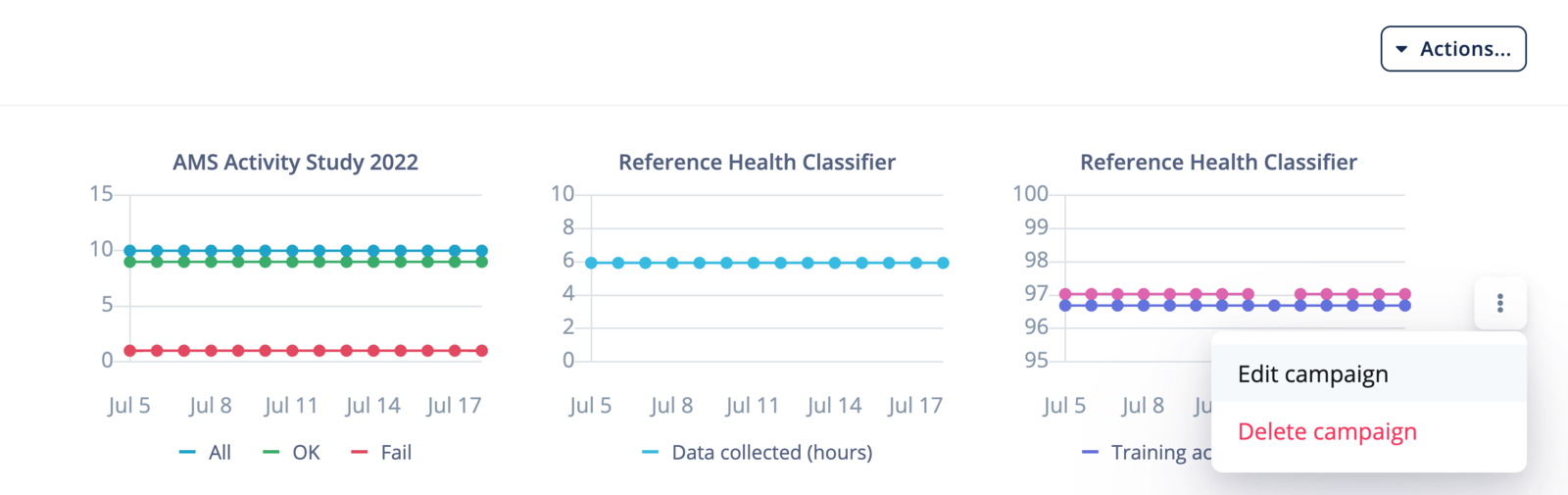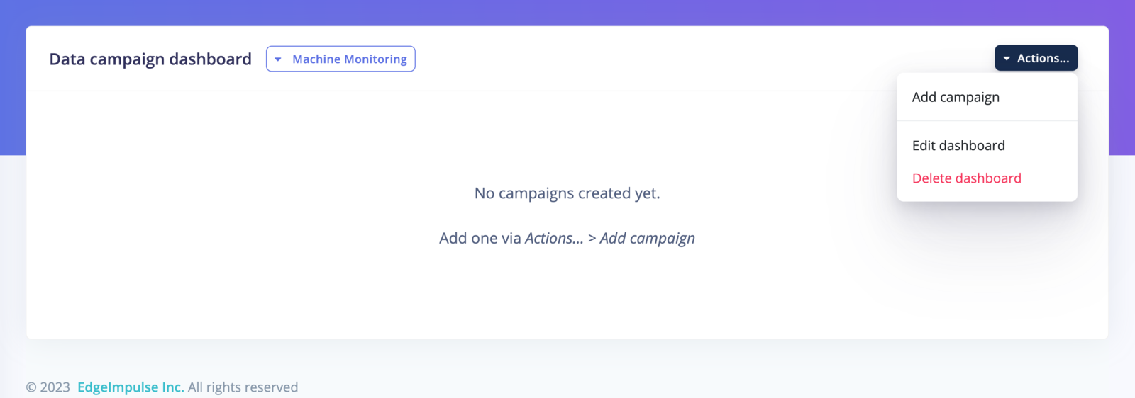 Once your dashboard is created, you can add your custom campaigns. It’s where you will specify which metrics are important to you and your use case. Click on Actions… -> Add campaign