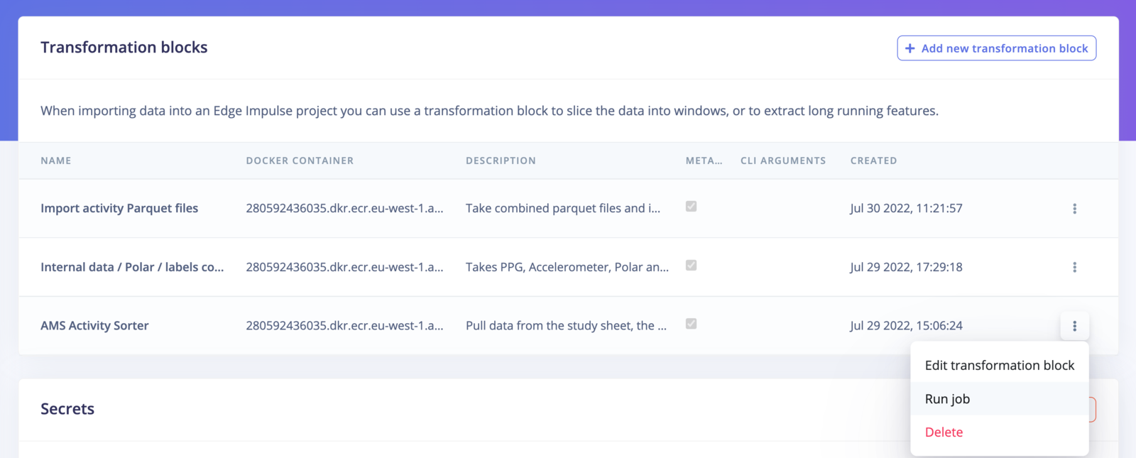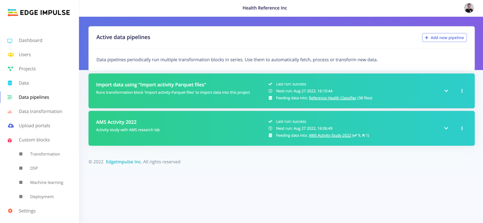 To run your pipeline from Edge Impulse studio, click on the⋮ button and select Run pipeline now.
