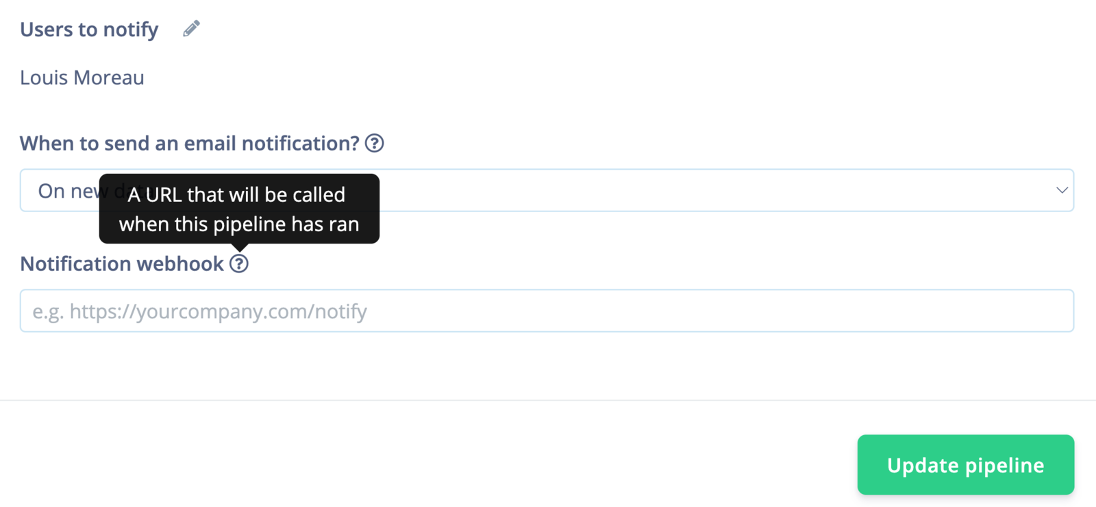 Another useful feature is to create a webhook to call a URL when the pipeline has ran. It will run a POST request containing the following information:
