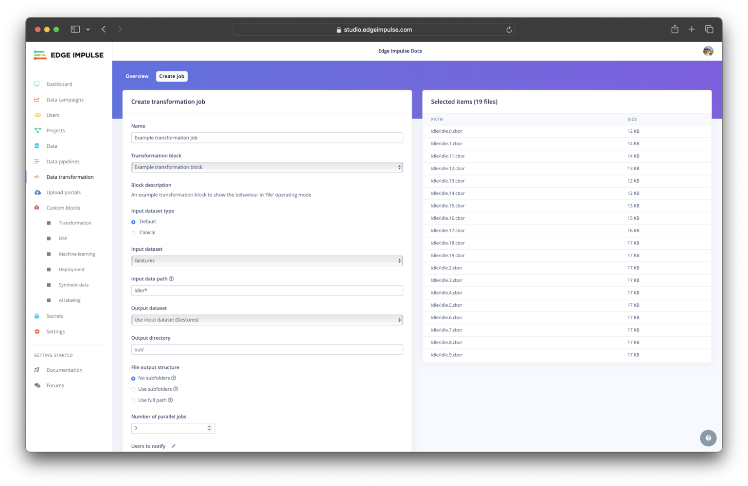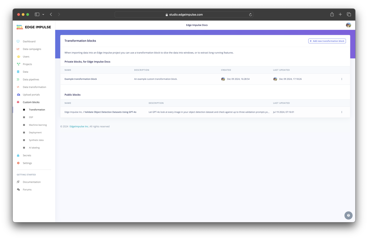Edge Impulse has the ability to incorporate pre-built transformation blocks into the platform and make these available for all organizations to use. Pre-built transformation blocks may be added over time as recurring needs or interests emerge. As these blocks are added to the platform, they will be found within your organization by going to the Transformation left sidebar menu item under Custom blocks. The pre-built blocks will be listed under the Public blocks section at the bottom of the transformation blocks overview page.Custom transformation blocks