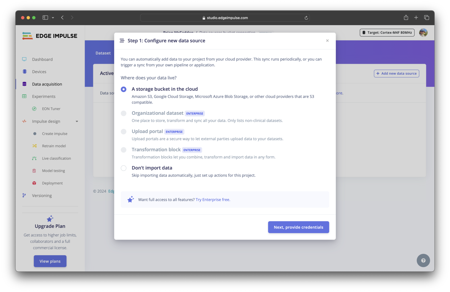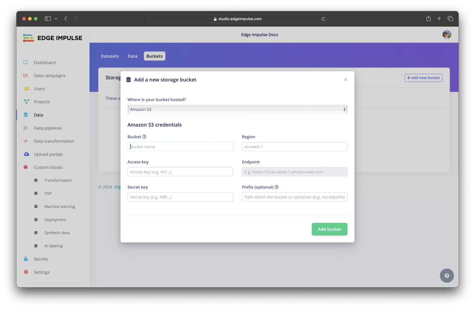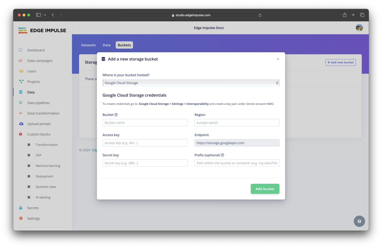 Cloud storage can be connected directly to a project. To connect, access your project, select Data acquisition in the left sidebar menu, select the Data sources tab at the top of the page, then click the+ Add new data source. Follow the instructions in the modal window that pops up.