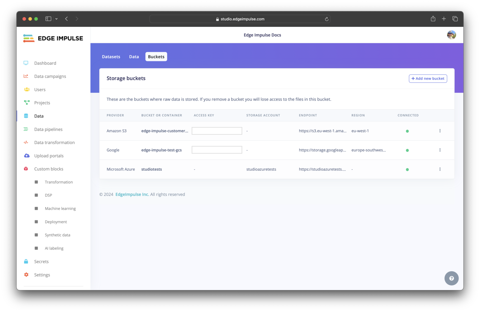In order to verify the connection to the cloud storage provider, Edge Impulse will write an.ei-portal-check file that will be subsequently deleted. Once a bucket is successfully connected to your organization, a green dot will appear in the connected column on the buckets overview page.