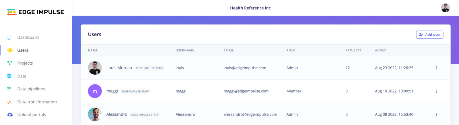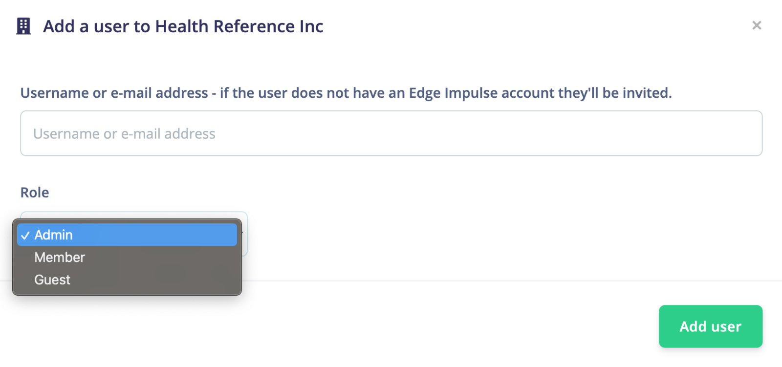 It is important to note that there are two types of users in Edge Impulse: Project Users and Organization Users. Organization Users, typically holding roles like Admin, are responsible for the overarching management and customization of organizational elements, including datasets, storage buckets, and white label attributes. These users also encompass the capabilities of Project Users. Conversely, Project Users, often in roles such as Member or Guest, are limited to specific project involvement, focusing on collaboration and contributions at the project level, without access to broader organizational management functions. They are granted access only to certain project data to maintain the security of raw data in organizational datasets.Organization User Roles