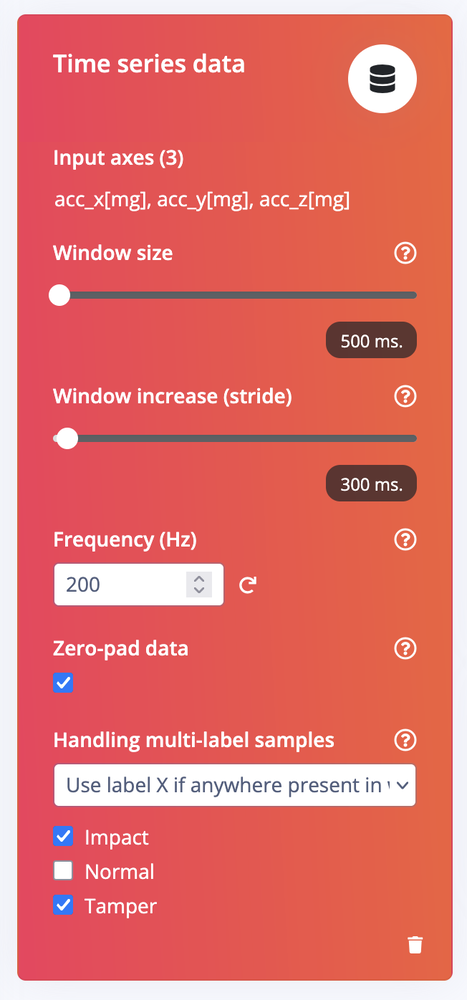 When working with time-series data labeled using the multi-label format, detecting short-duration or critical events (e.g. tamper detection, fall detection or short noises among others) is possible. Edge Impulse provides flexible strategies for assigning labels to windows of data during training and inference to ensure the events represented. During the data acquisition process, it’s important to understand the available labeling strategies. Choosing the right approach for handling multi-label events ensure accurate detections. The labeling strategies are selected when designing your impulse in the Create Impulse screen. You need to define your appropriate strategy to detect multi-label events in your data.