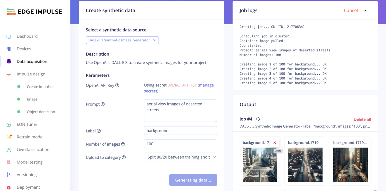 - Enter a Prompt: Describe the type of images you need (e.g., “A photo of a factory worker wearing a hard hat”, or some background data for object detection (of cars) “aerial view images of deserted streets”).