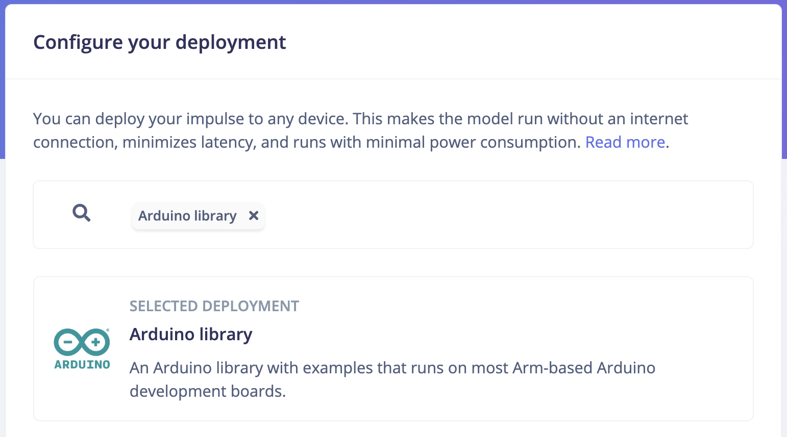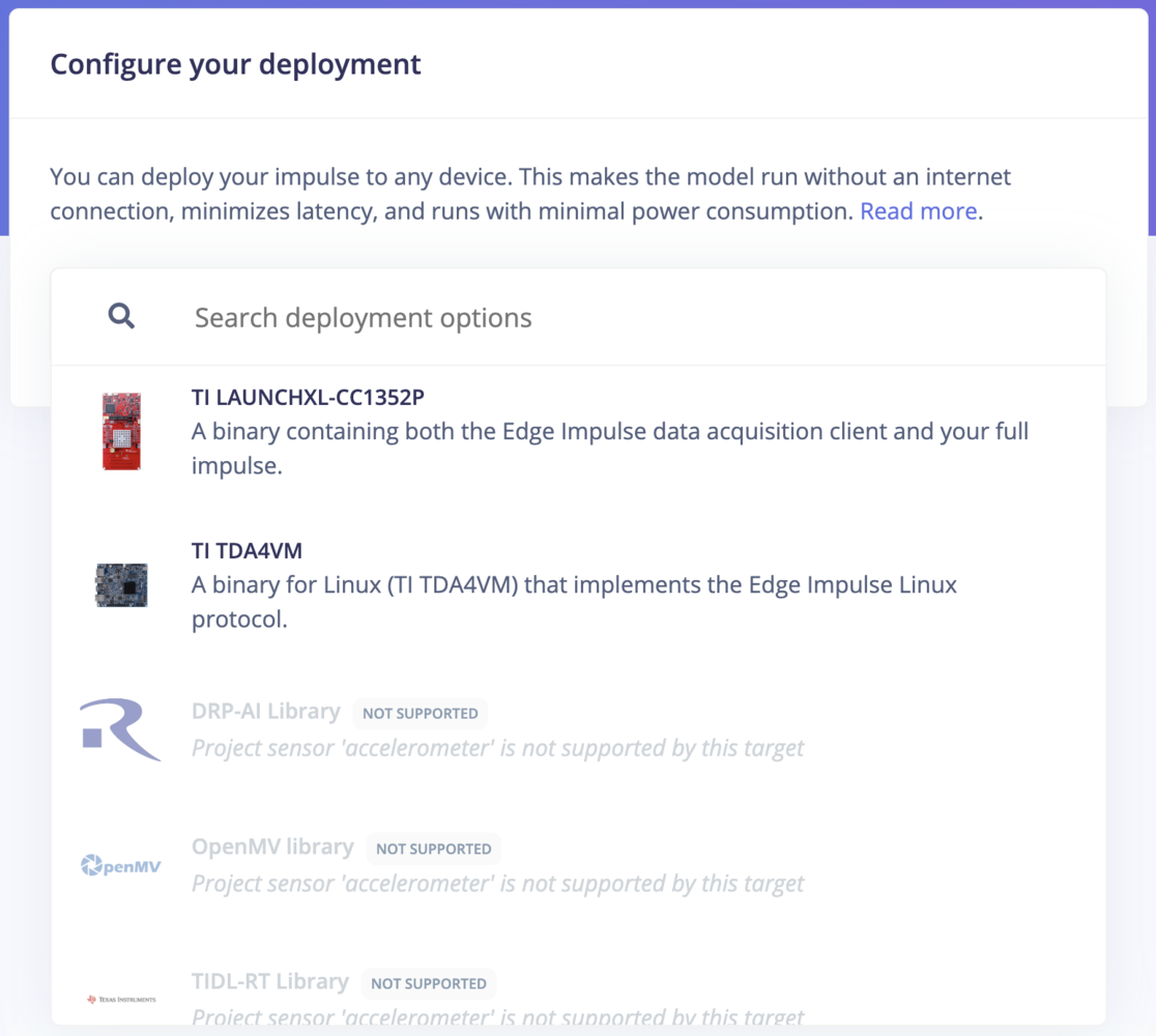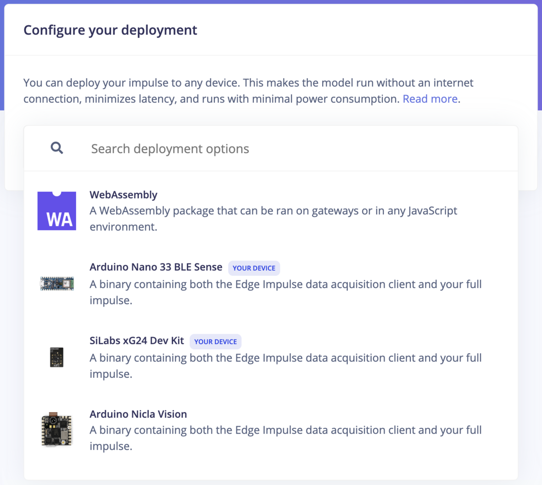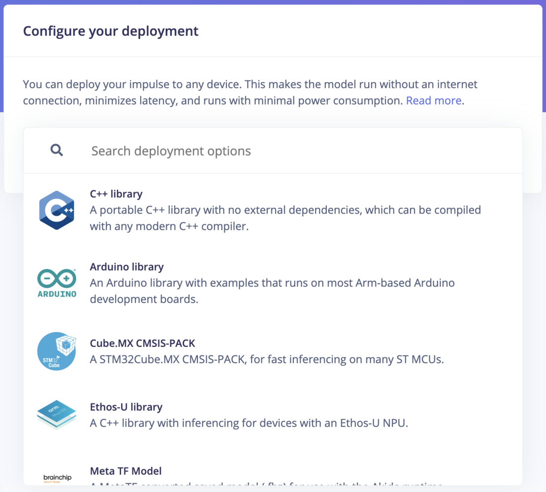 The Deployment page consists of a variety of deployment options to choose from depending on your target device. Regardless of whether you are using a fully supported development board or not, you can deploy your impulse to any device. The C++ library and Edge Impulse SDK enable the model to run without an internet connection on the device, minimize latency, and with minimal power consumption.