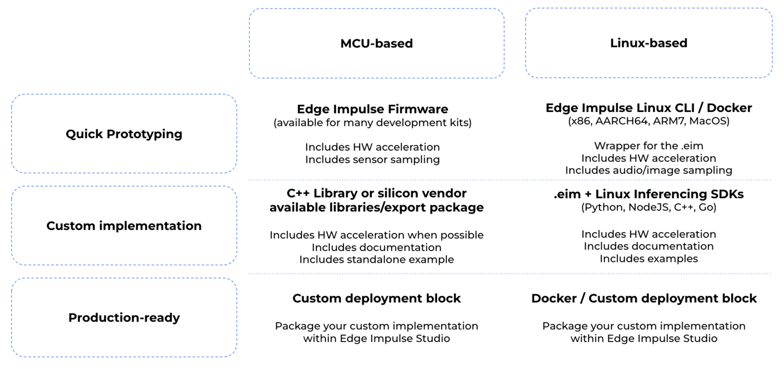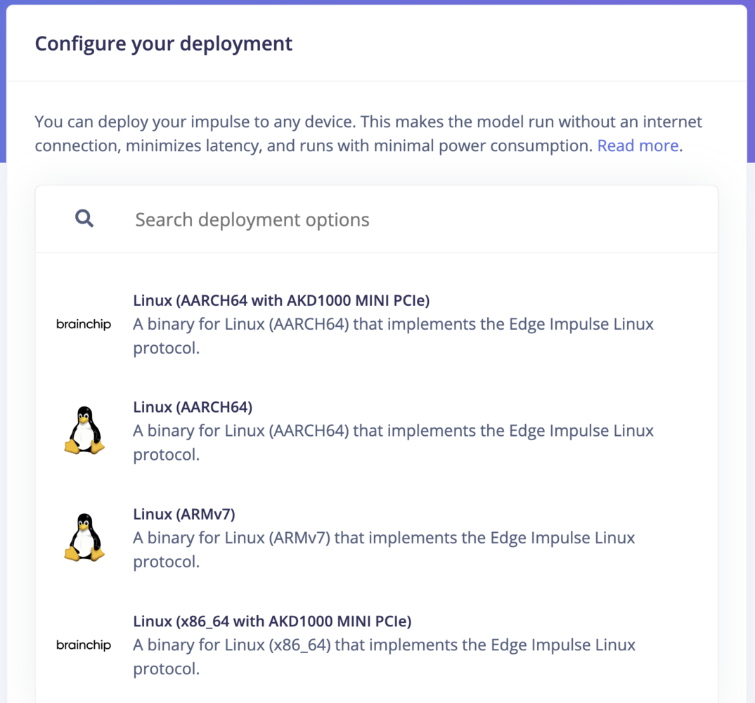 If you are developing for Linux-based devices, you can use Edge Impulse for Linux for deployment. It contains tools that let you collect data from any microphone or camera, can be used with the Node.js, Python, Go and C++ SDKs to collect new data from any sensor, and can run impulses with full hardware acceleration - with easy integration points to write your own applications. For a deep dive into deploying your impulse to Linux targets using Edge Impulse for Linux, you can visit the Edge Impulse for Linux guides.