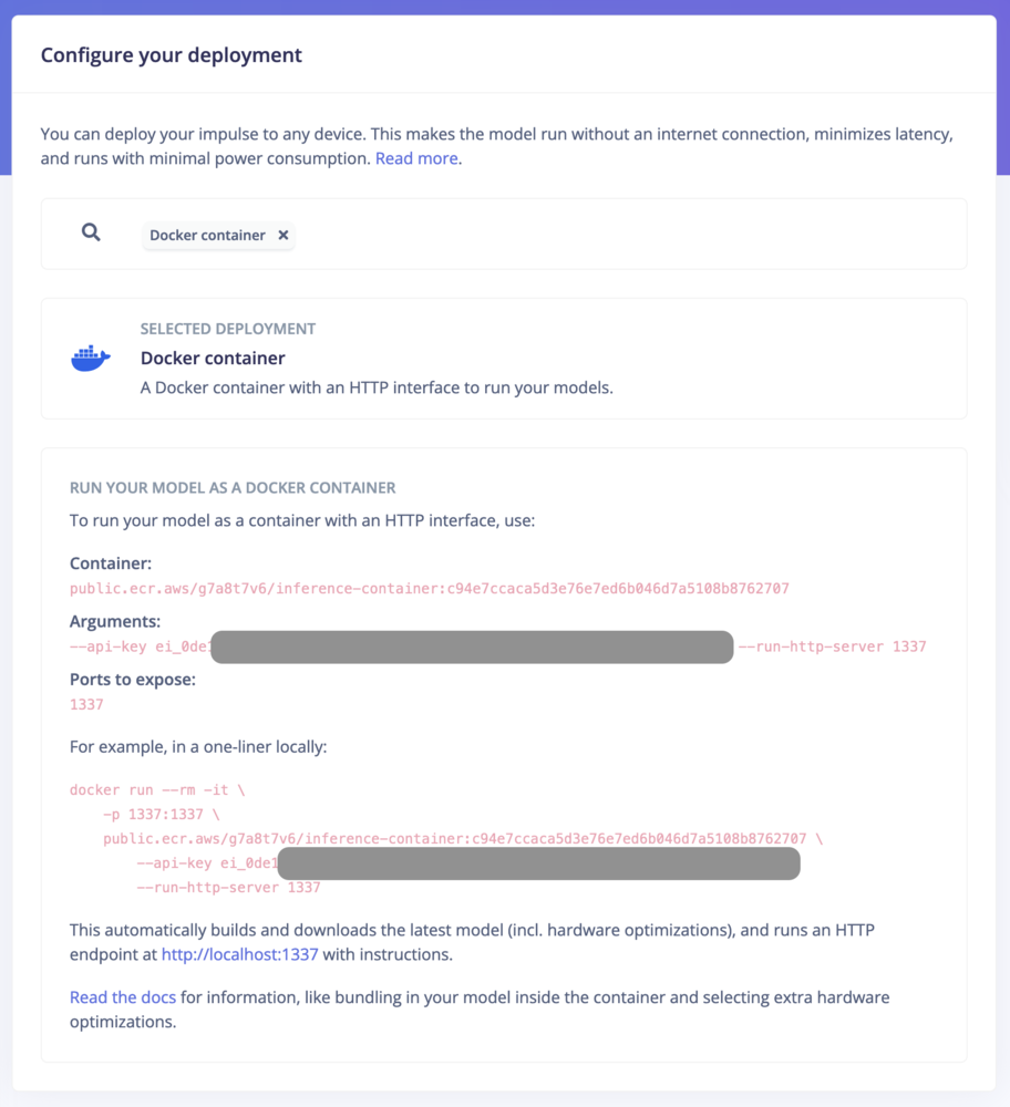 Deploying Edge Impulse models as a Docker container allows for packaging signal processing, configurations, and learning blocks into a single container that exposes an HTTP inference server. This method is ideal for environments supporting containerized workloads, facilitating deployment on gateways or in the cloud with full hardware acceleration for most Linux targets. Users can initiate deployment by selecting the “Docker container” option within the Deployment section of their Edge Impulse project. See how to run inference using a Docker container.