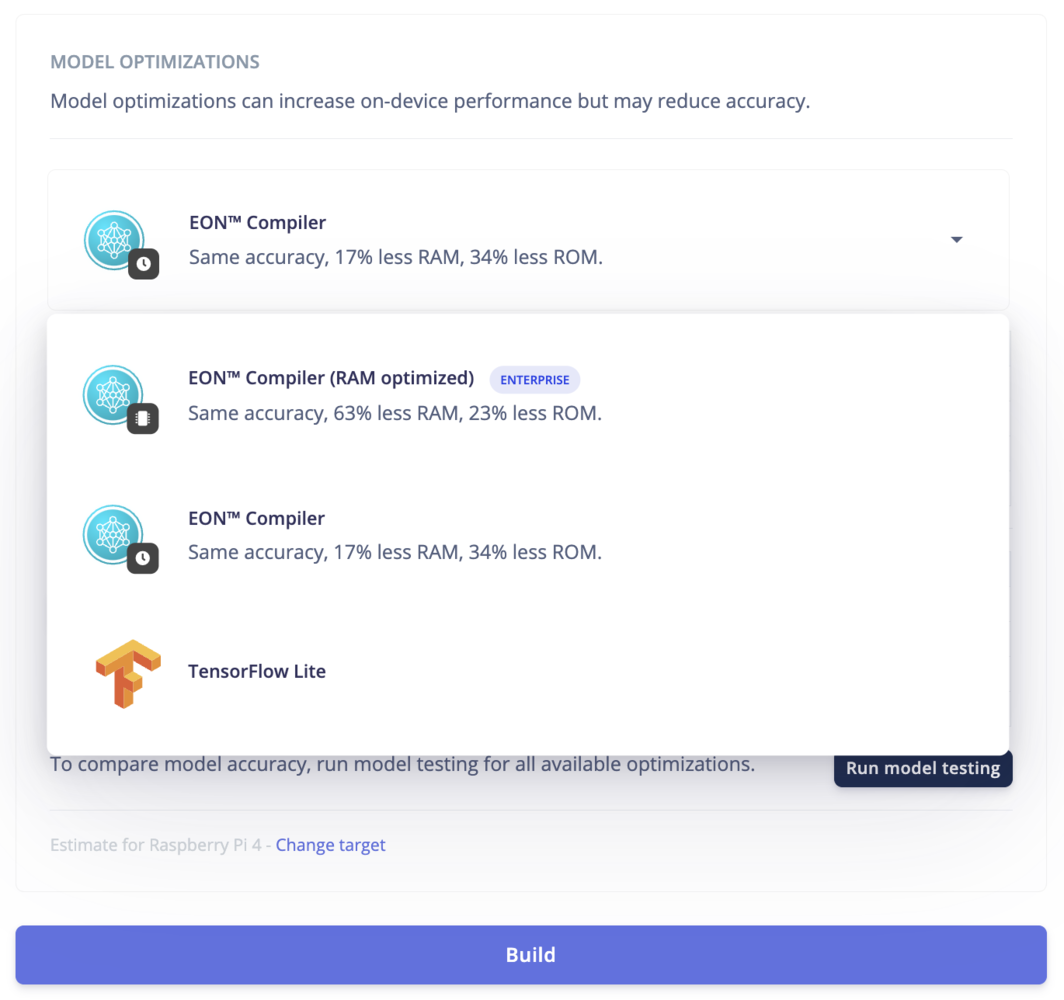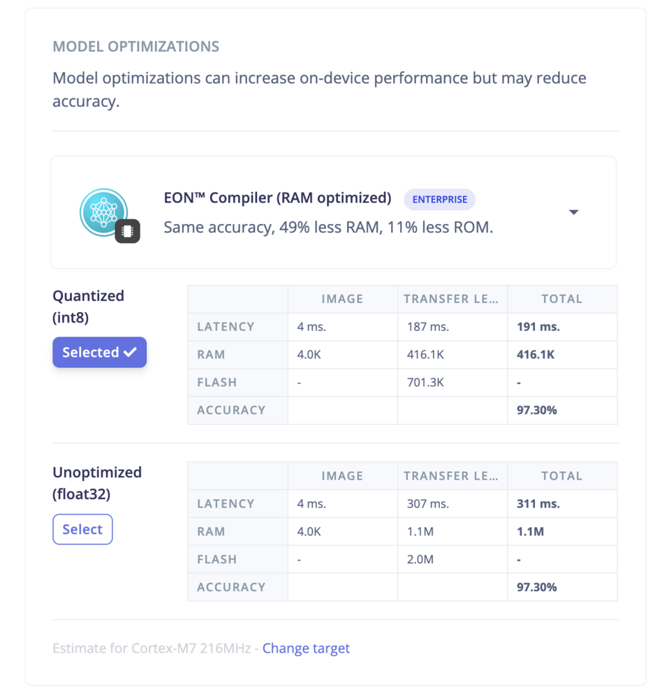- Compiler options: TFLite vs EON Compiler. The EON Compiler also comes with an extra option: EON Compiler (RAM optimized) to reduce the RAM even further when possible.
