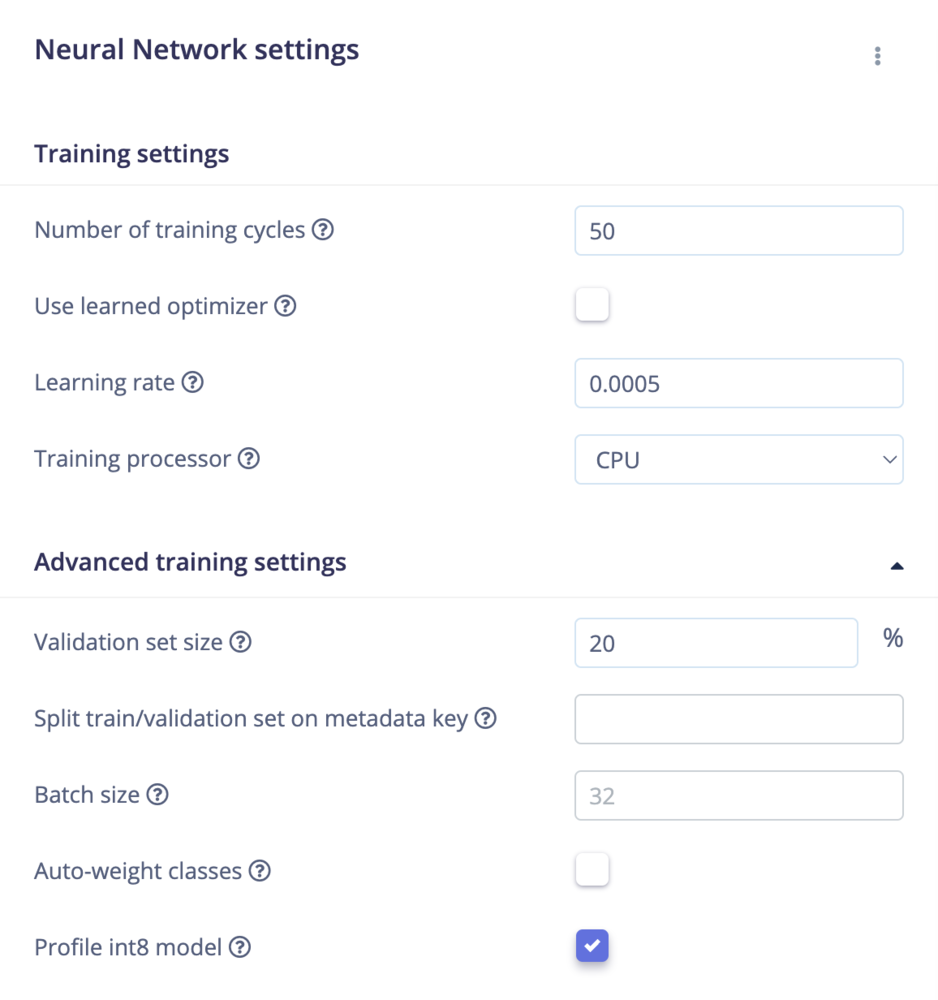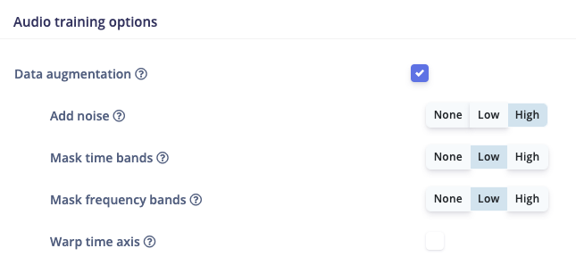 Edge Impulse provides easy to use data augmentation options for several combinations of data and model types. If available, these settings will appear within the Neural Network settings. Augmentation can be applied by enabling the corresponding checkbox and entering associated parameters if applicable.Audio classification