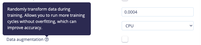 When using a transfer learning block in your impulse for image classification tasks, augmentation can be enabled through a single checkbox. When enabled, random transformations are applied to your original images that include flipping (horizontally), zooming, cropping, and varying brightness.