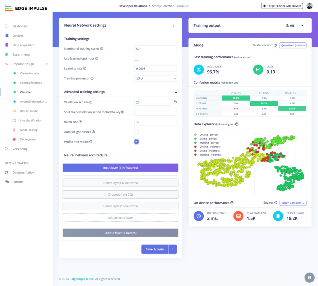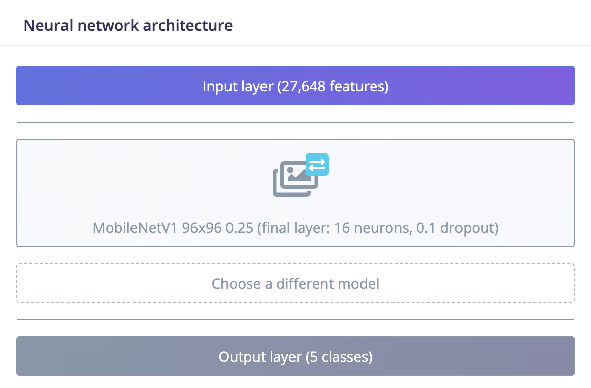 The choice of augmentation options will depend on the object detection model that has been selected. For example, a FOMO model will offer a single checkbox that enables flipping (horizontally), zooming, cropping, rotating, varying brightness, and varying contrast; other models will offer different parameters based on the model head selected; and some other model types may not offer augmentation.Neural Network architecture