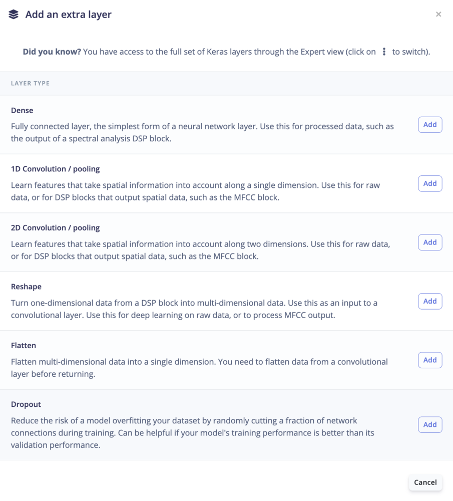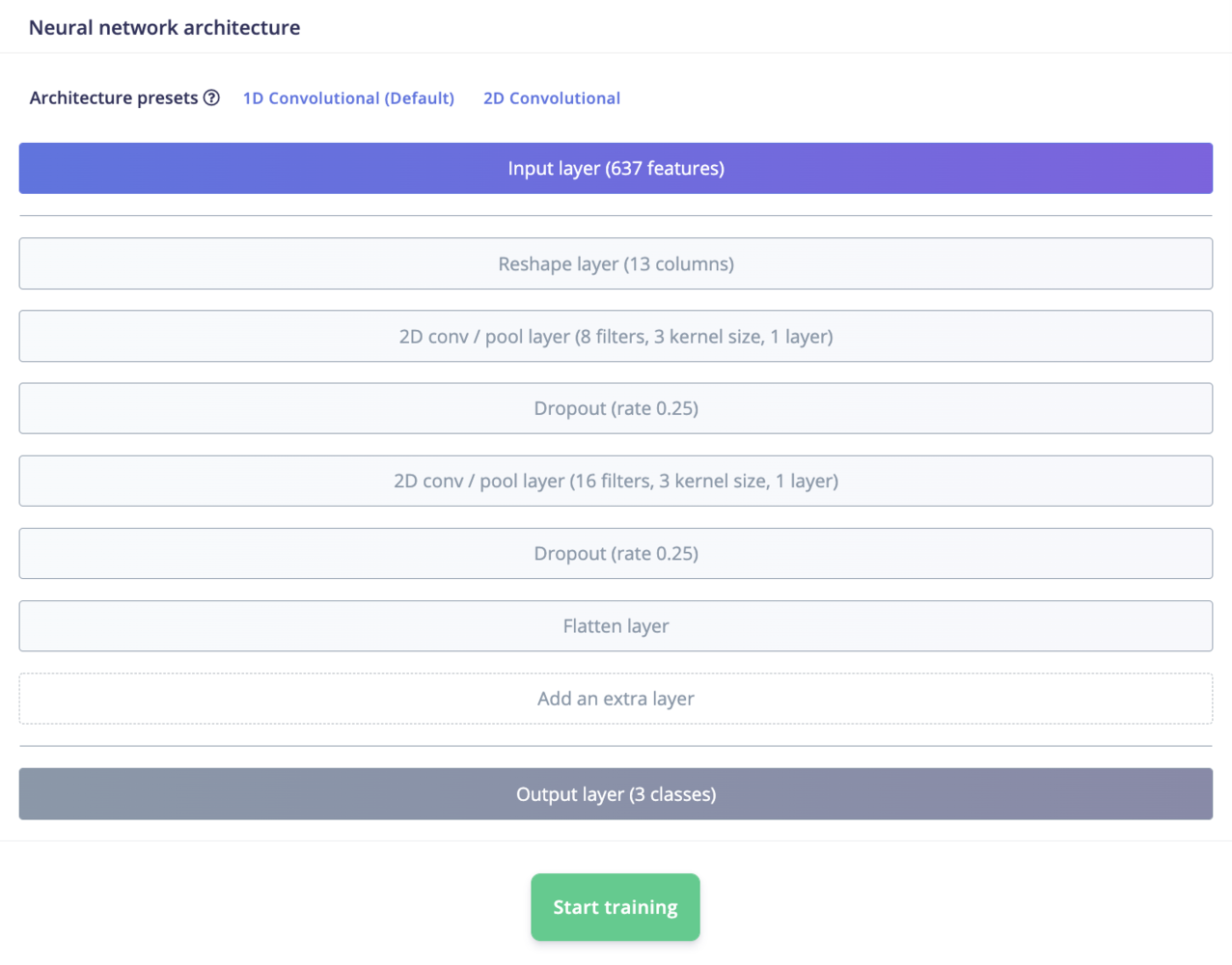 For classification and regression tasks, you can edit the layers directly from the web interface. Depending on your project type, we may offer to choose between different architecture presets to help you get started.