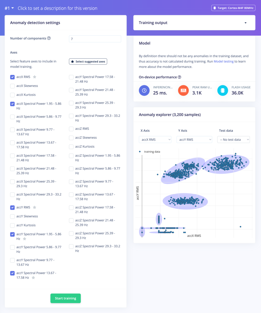 The different axes correspond to the generated features from the pre-processing block. The chosen axes will use the features as the input data for the training.Click on the Select suggested axes button to harness the results of the feature importance output.