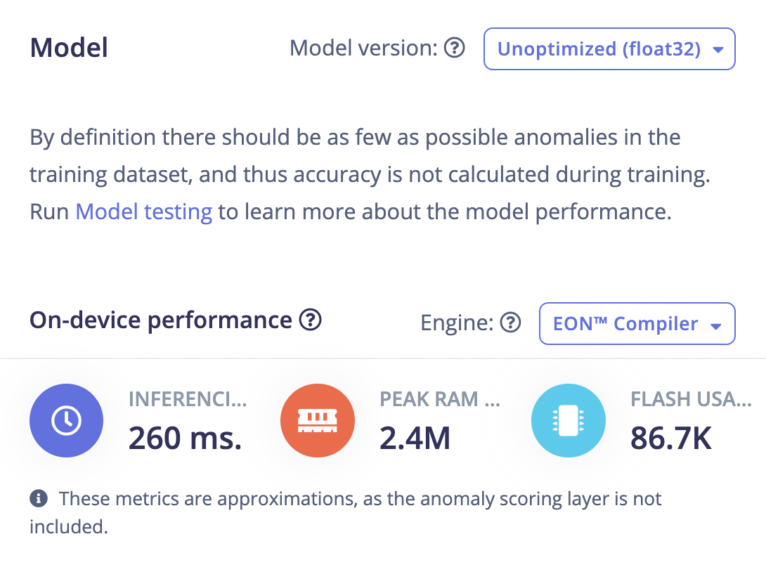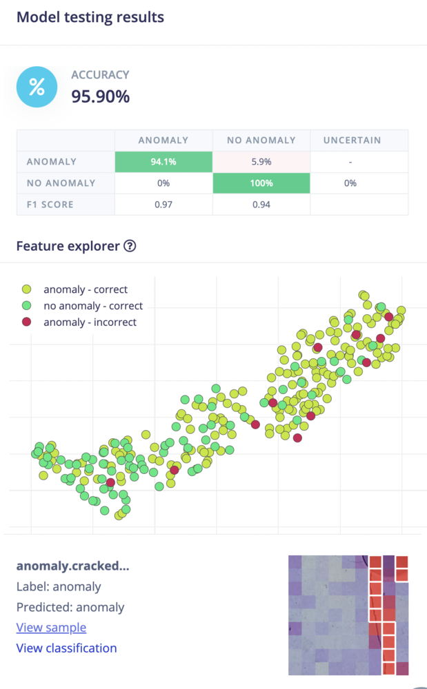 The GMM Visual Anomaly Detection learning block has one adjustable parameter: capacity. The neural network architecture is also adjustable. Regardless of what resolution we intend to use for raw image input, we empirically get the best result for anomaly detection from using96x96 ImageNet weights. We use 96x96 weights since we’ll only being used the start of MobileNet to reduce to 1/8th input.