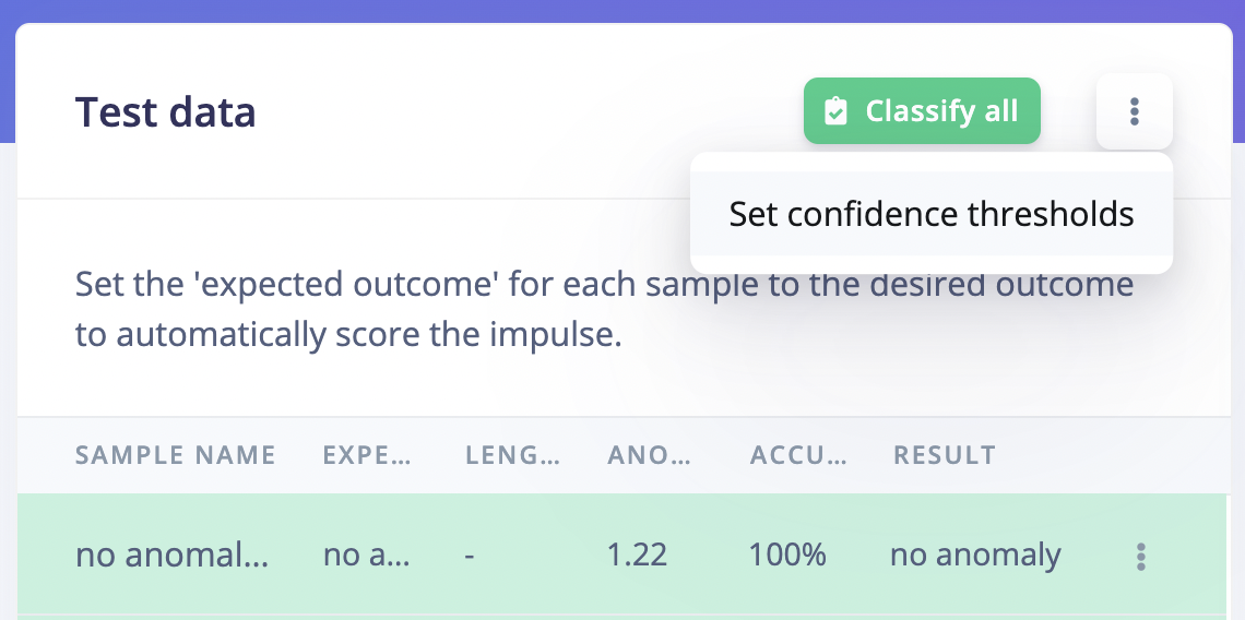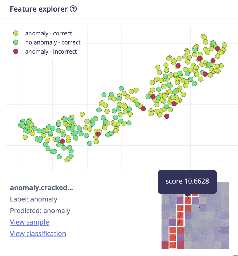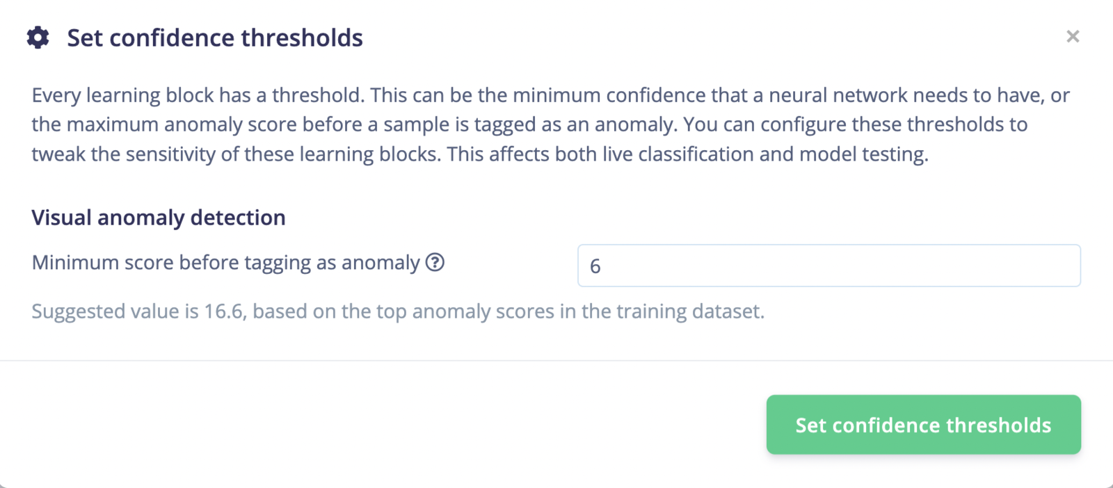 In the example above, you will see that some samples have regions that are considered asno anomaly while the expected output is an anomaly. To adjust this prediction, you can set the Confidence thresholds, where you can also see the default or suggested value: “Suggested value is 16.6, based on the top anomaly scores in the training dataset.”: