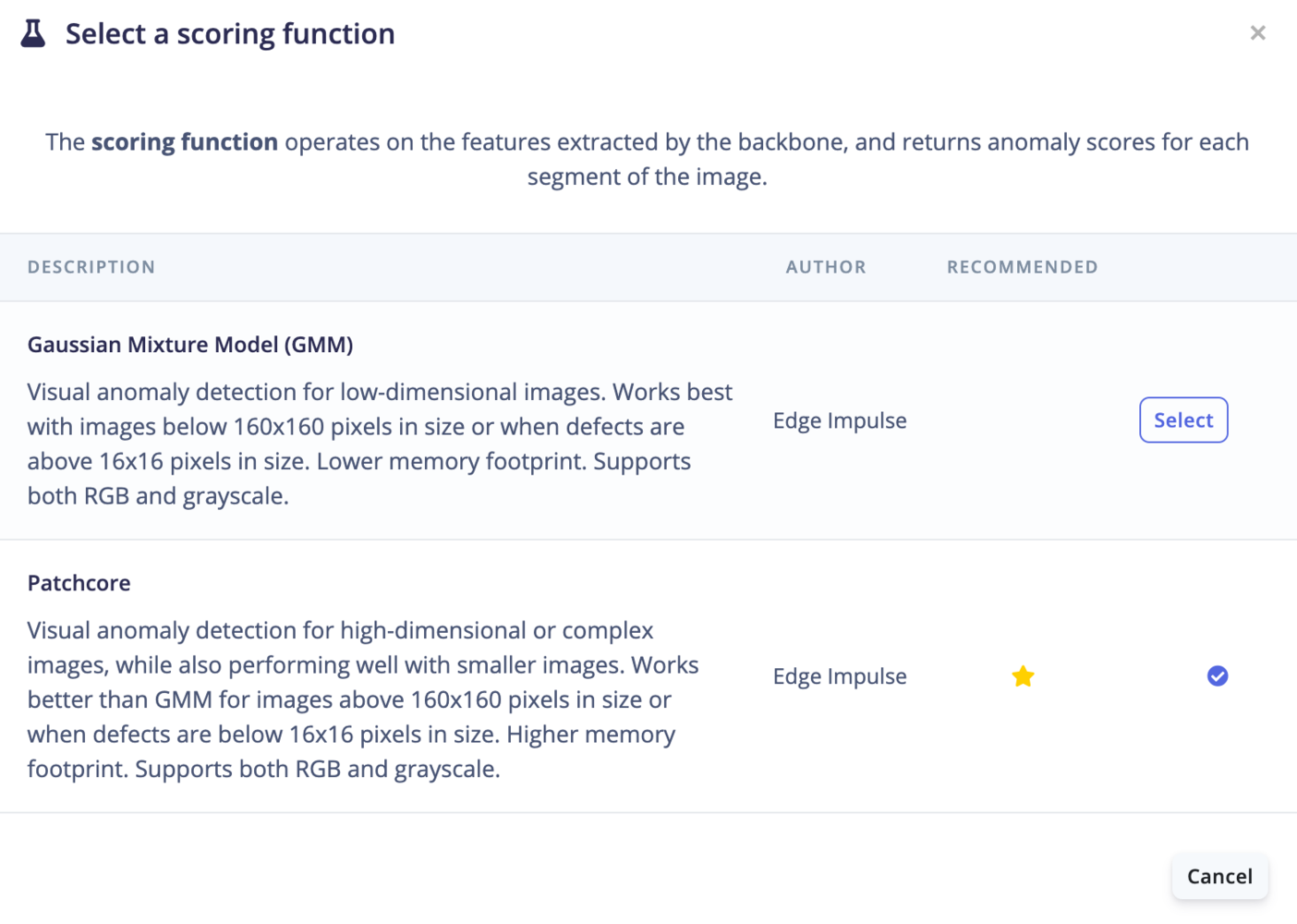Based on the deployment target configuration of your project, the Visual Anomaly Detection (FOMO-AD) learning block will default to either GMM for a low-power device or Patchcore for a high-power device.
