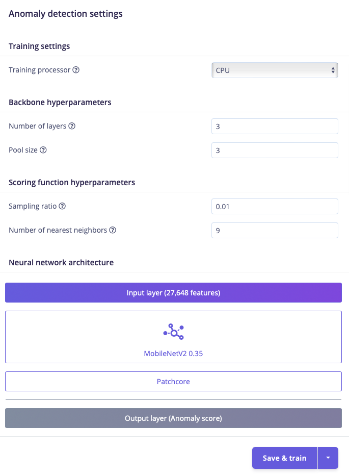 The PatchCore Visual Anomaly Detection learning block has multiple adjustable parameters. The neural network architecture is also adjustable.- Number of layers: The number of layers in the feature extractor