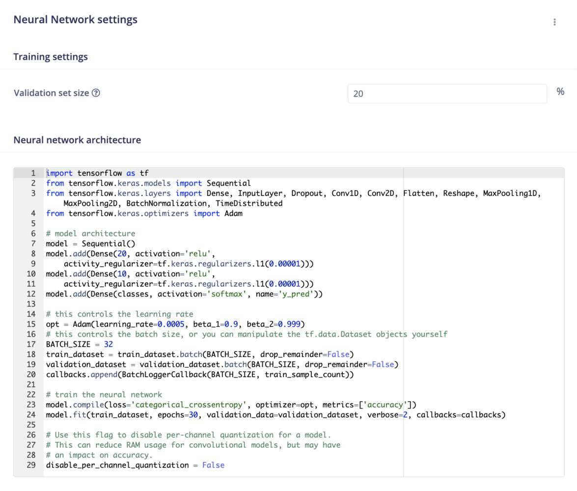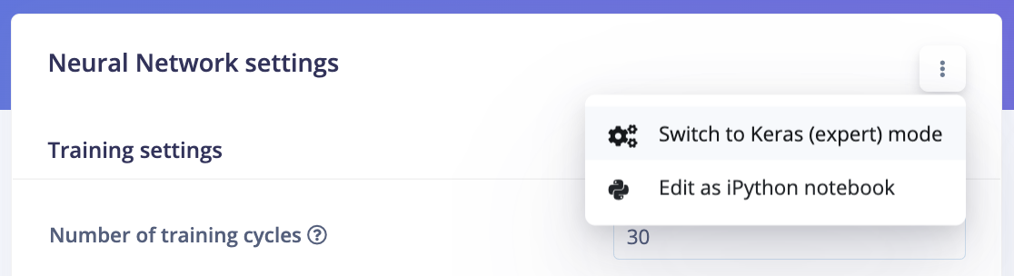 To enable Keras (expert) mode in Edge Impulse:- Navigate to the model configuration page in Edge Impulse Studio.