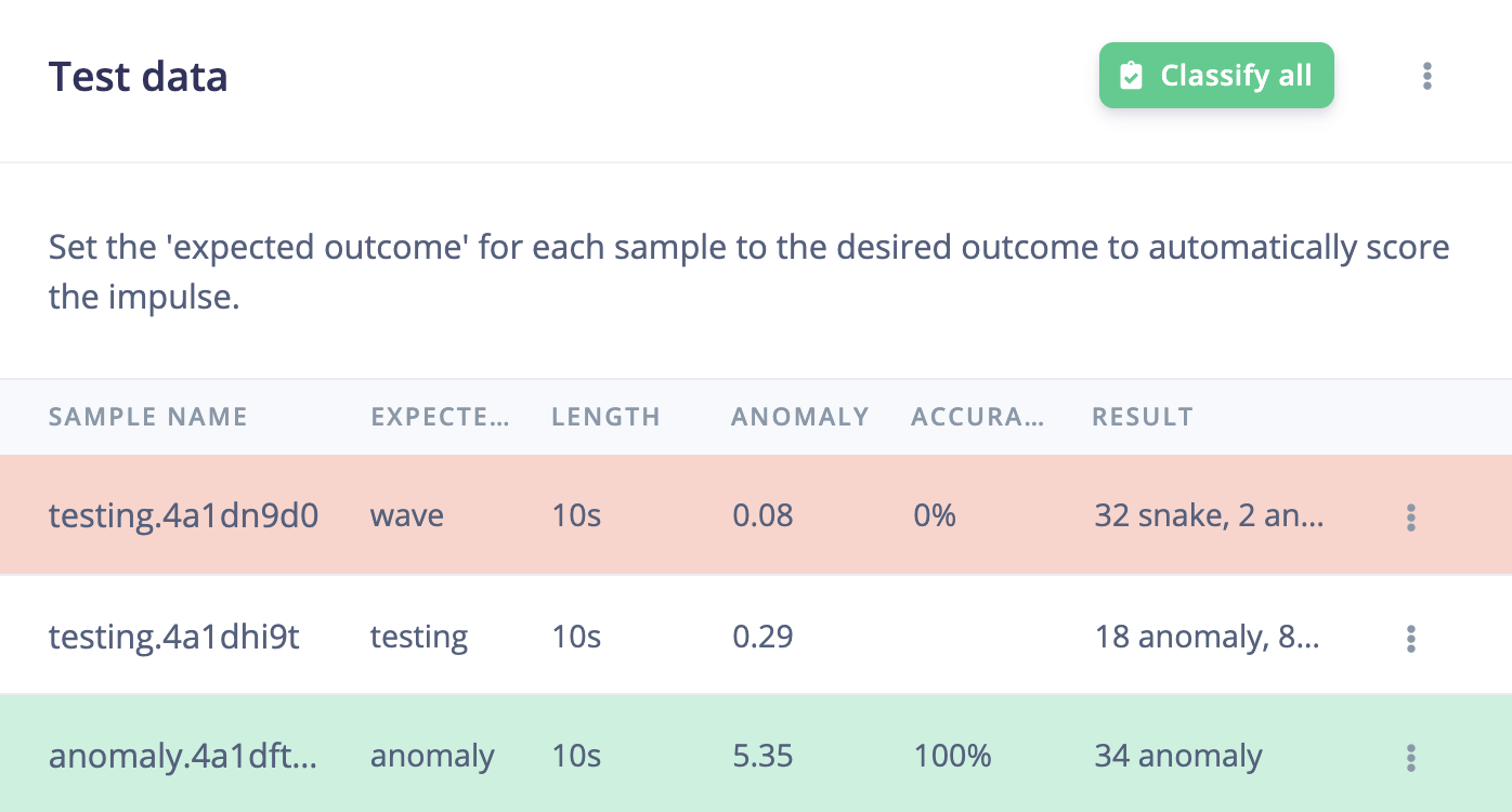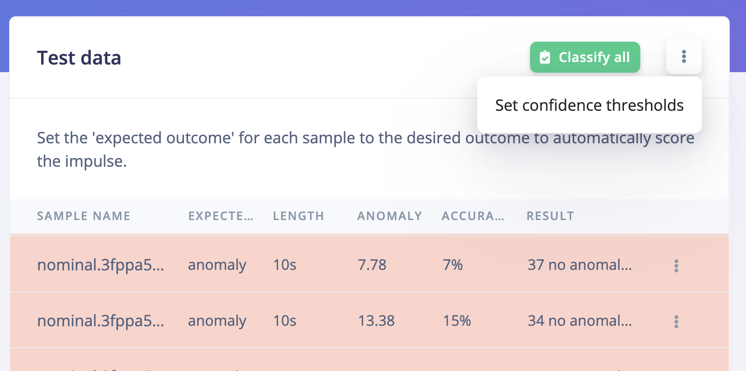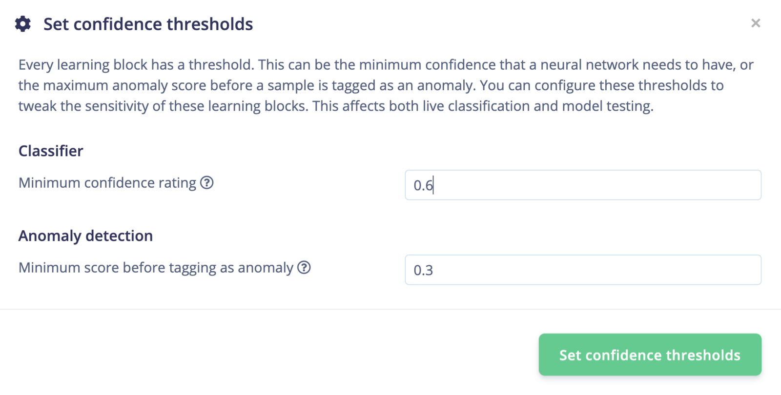 Every learning block has a threshold. This can be the minimum confidence that a neural network needs to have, or the maximum anomaly score before a sample is tagged as an anomaly. You can configure these thresholds to tweak the sensitivity of these learning blocks. This affects both live classification and model testing.