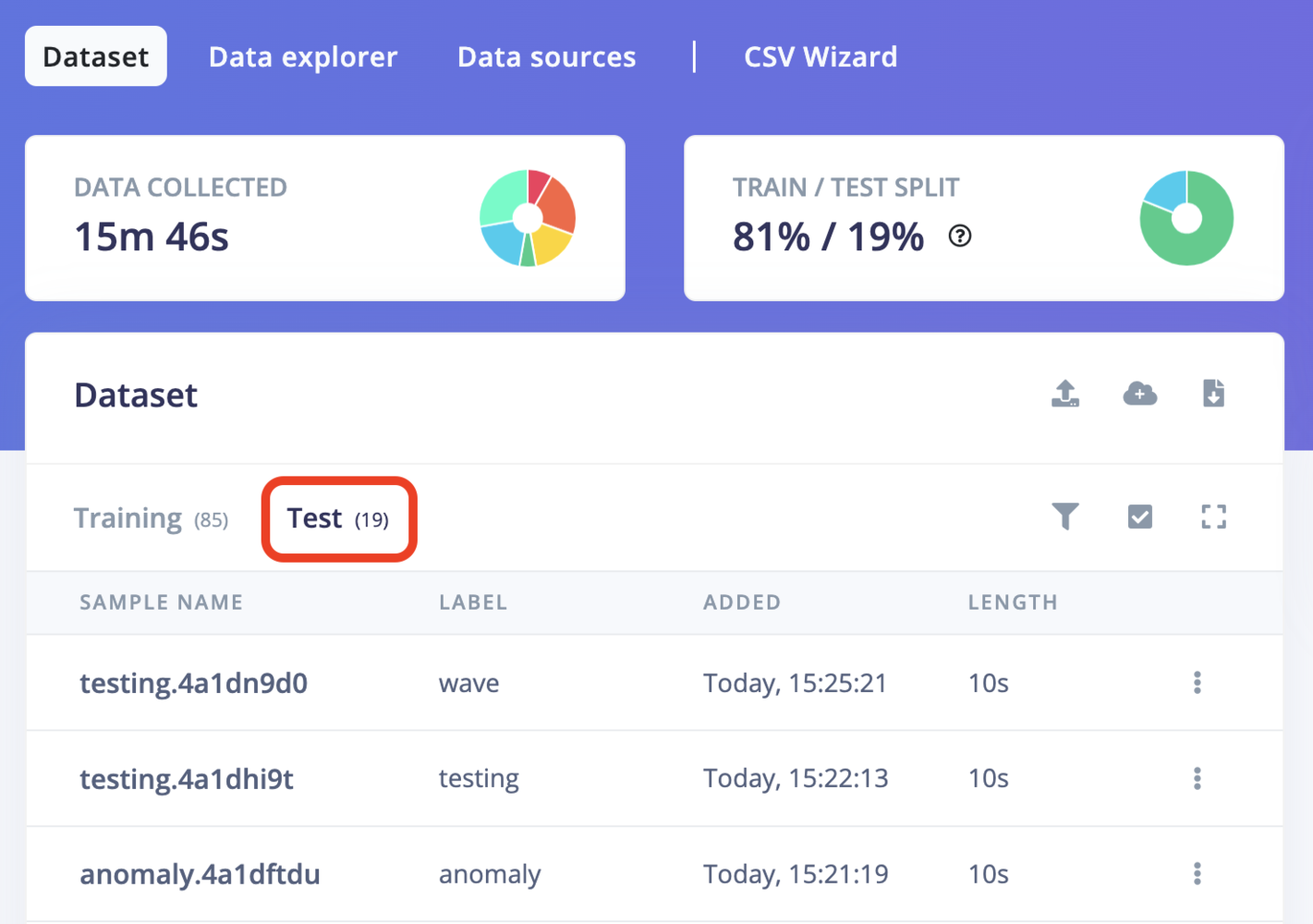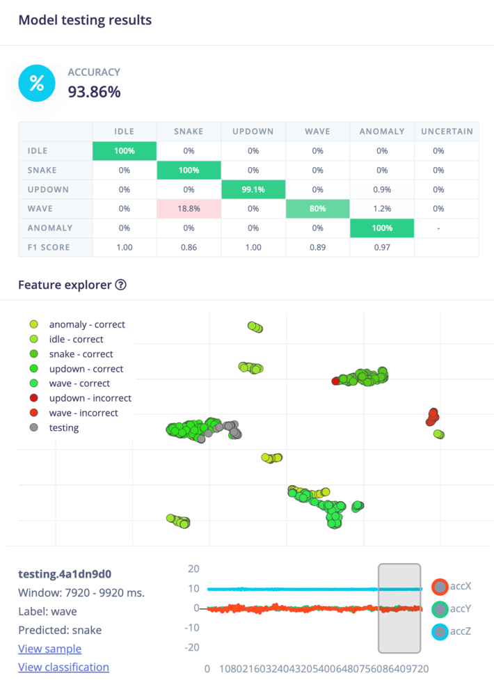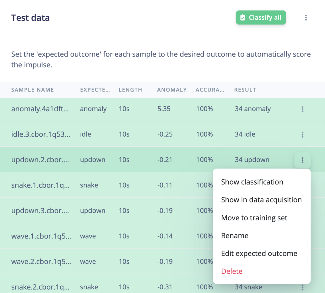 Every learning block has a threshold. This can be the minimum confidence that a neural network needs to have, or the maximum anomaly score before a sample is tagged as an anomaly. You can configure these thresholds to tweak the sensitivity of these learning blocks. This affects both live classification and model testing.