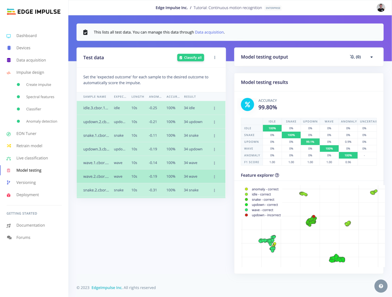 To test your model, go to Model testing, select the desired model version from the dropdown (either Unoptimized (float32) or Quantized (int8)), and click Test all. The model will classify all of the test set samples and give you an overall accuracy of how your model performed.Quantized (int8) model is not enabled by default and the fist step of enabling is in the settings menu beside the Classify all button