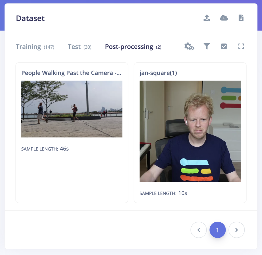 To configure object tracking you’ll need to upload one or more video files of representable scenes. E.g. a video of your production line if you want to track products on a conveyor belt; or a video of people walking around if you’re building intruder detection systems. This data does not need to be labeled. To upload this data, go to Data acquisition > Post-processing; and click the upload icon. We support video files in the most common formats, but there’s a 100MB file size limit.