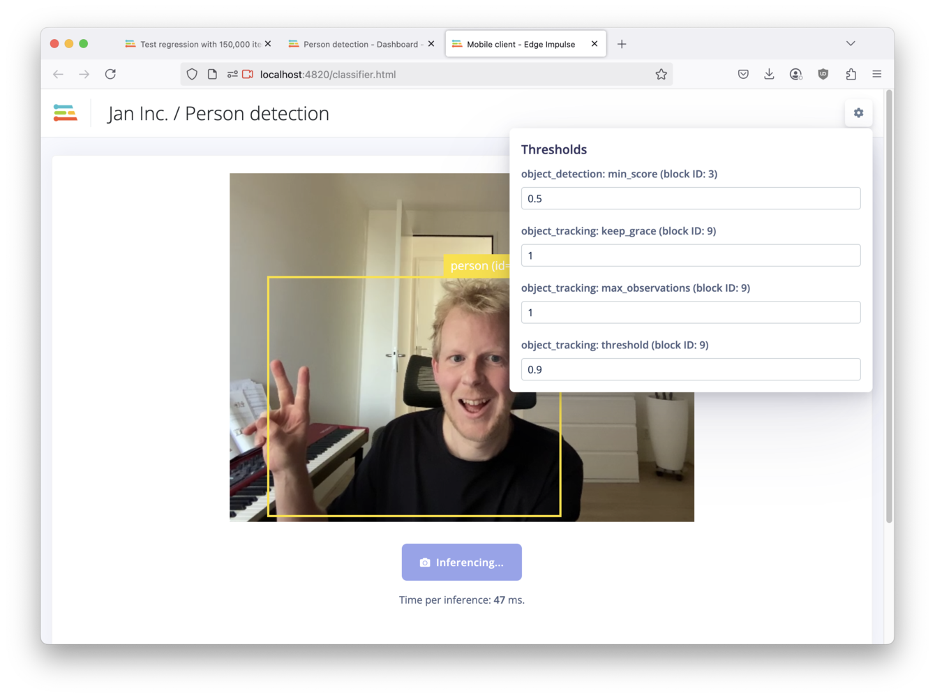 If you’re running your impulse in the Edge Impulse mobile client, you can configure thresholds in the UI as well (click the ‘gear’ icon).Node.js SDK