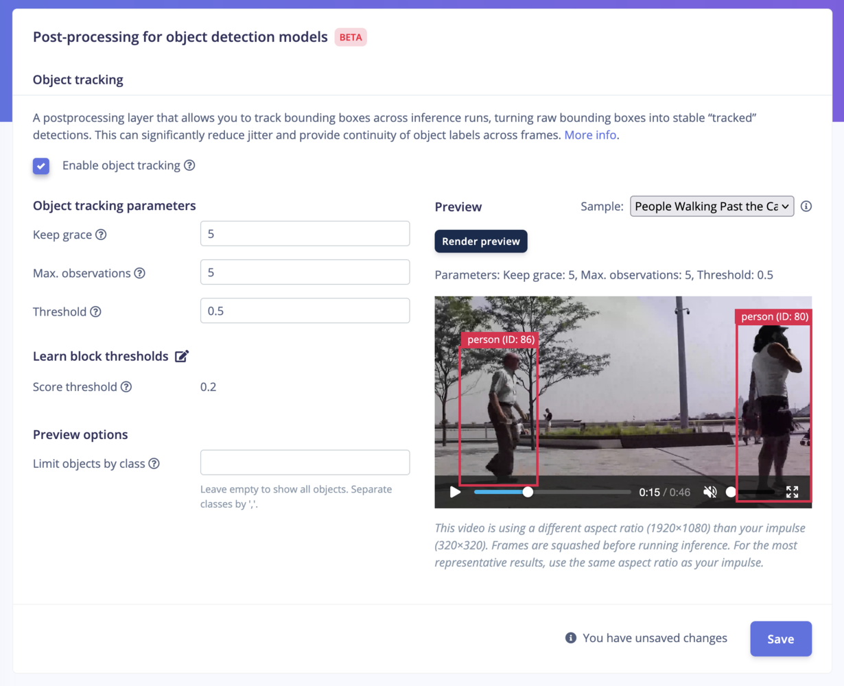 Once you’ve configured object tracking, all deployments (Linux, Mobile, EON Compiler, C++ library, WebAssembly, etc.) that contain an Object Detection block will automatically include the object tracking postprocessing layer. 🚀Re-configuring object tracking thresholds at runtime