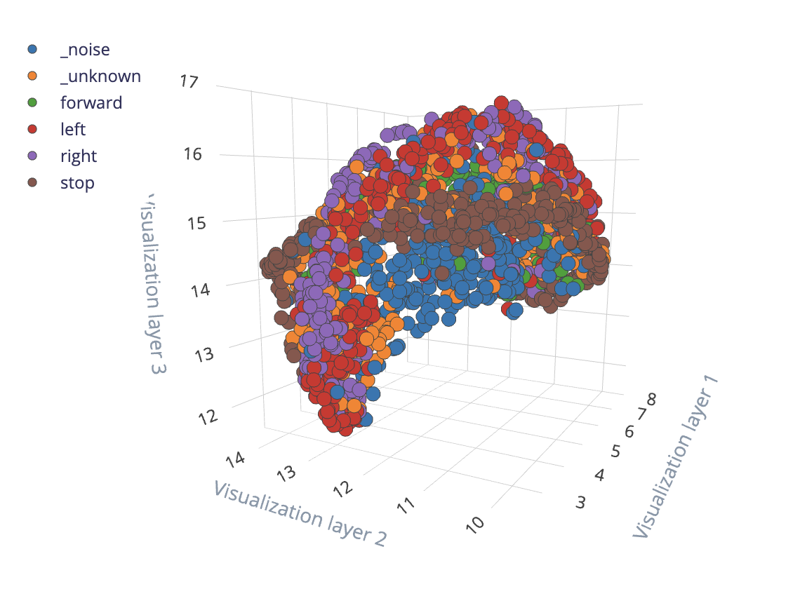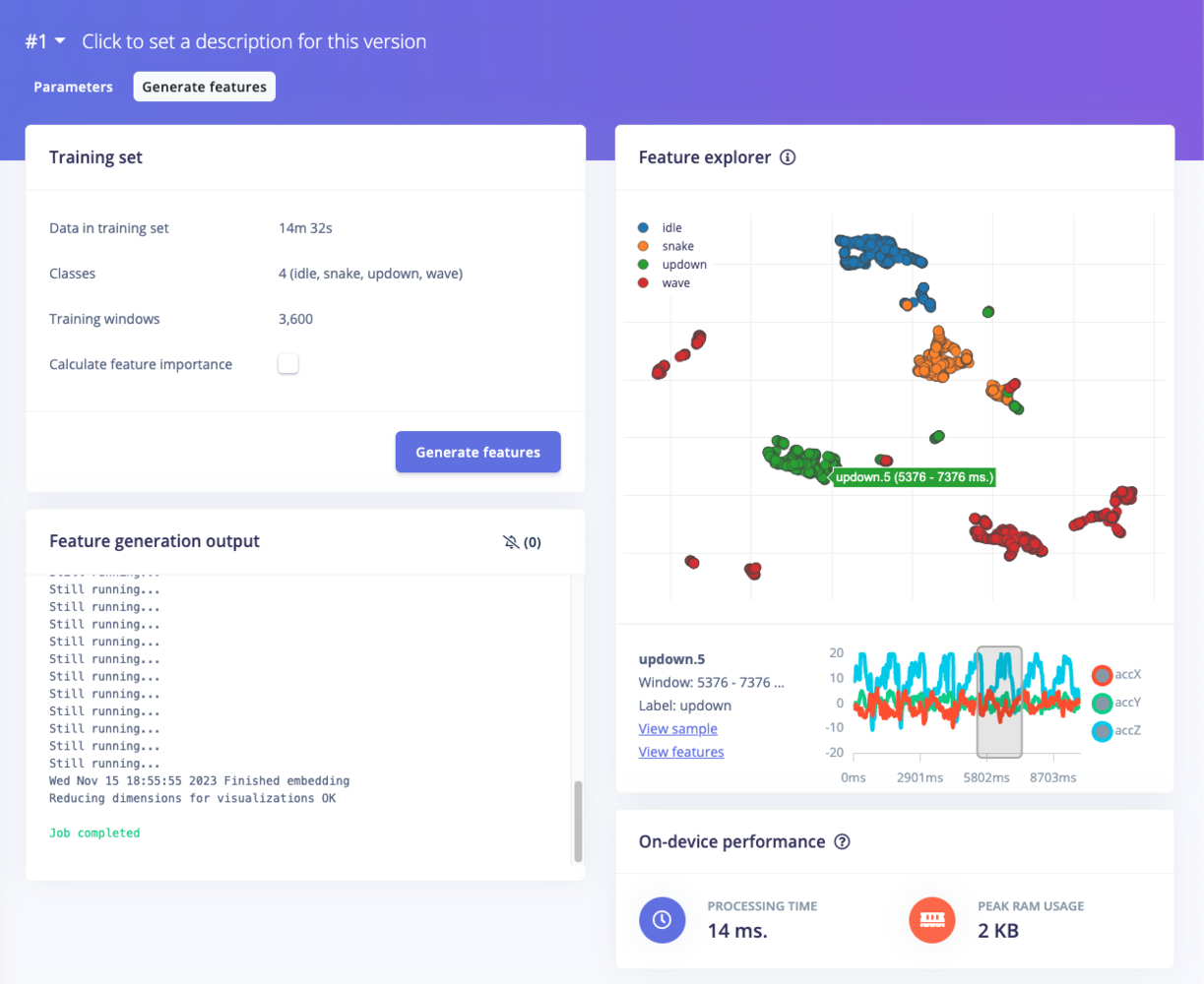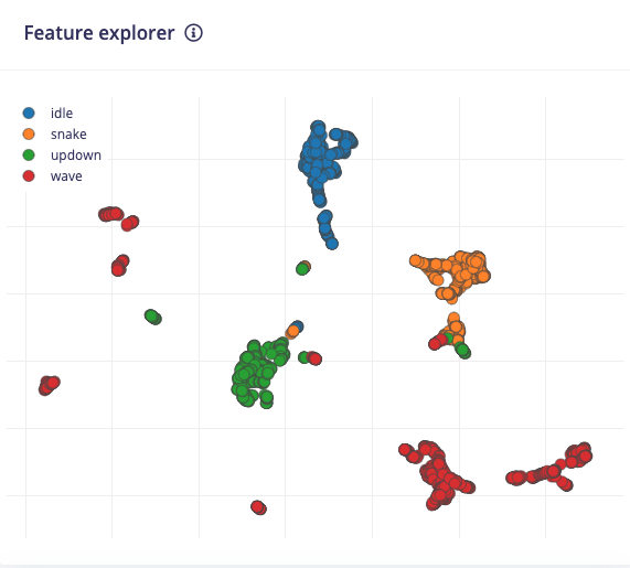 The feature explorer is an incredibly useful tool to help you analyze your dataset, your feature extraction (processing) method, and how well you should expect a machine learning model to classify new samples. We will use our example above, which consists of the spectral analysis features extracted from the continuous motion recognition tutorial to help you get started.