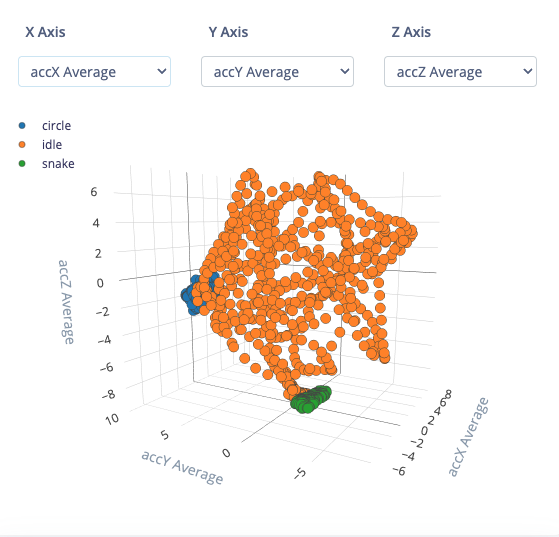 With the Flatten block, the points are drawn in a 3D space with the value for each axis coming from one of the features. For example, let’s say you chose average acceleration X, average acceleration Y, and average acceleration Z as your axes, and a sample had the following values for those features:- Avg accX = -0.24