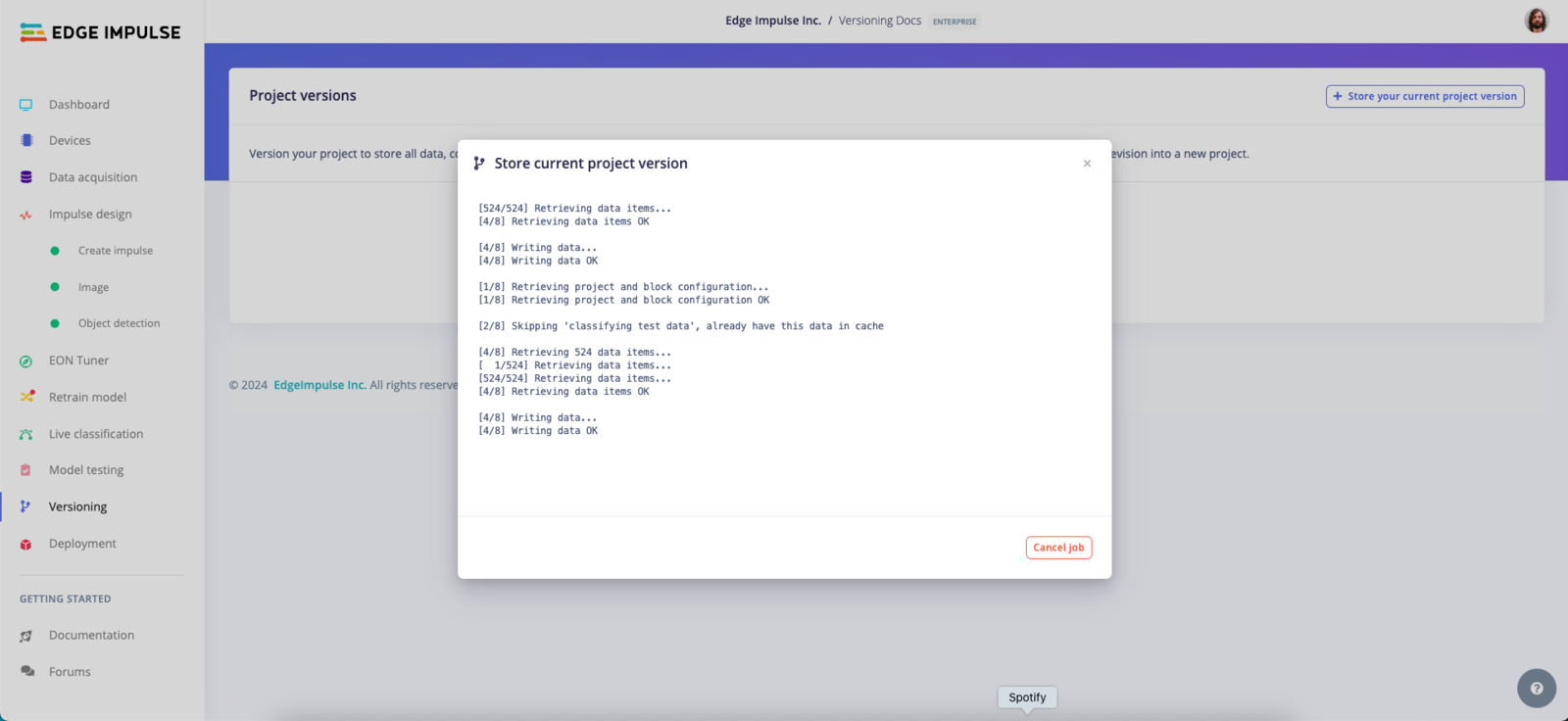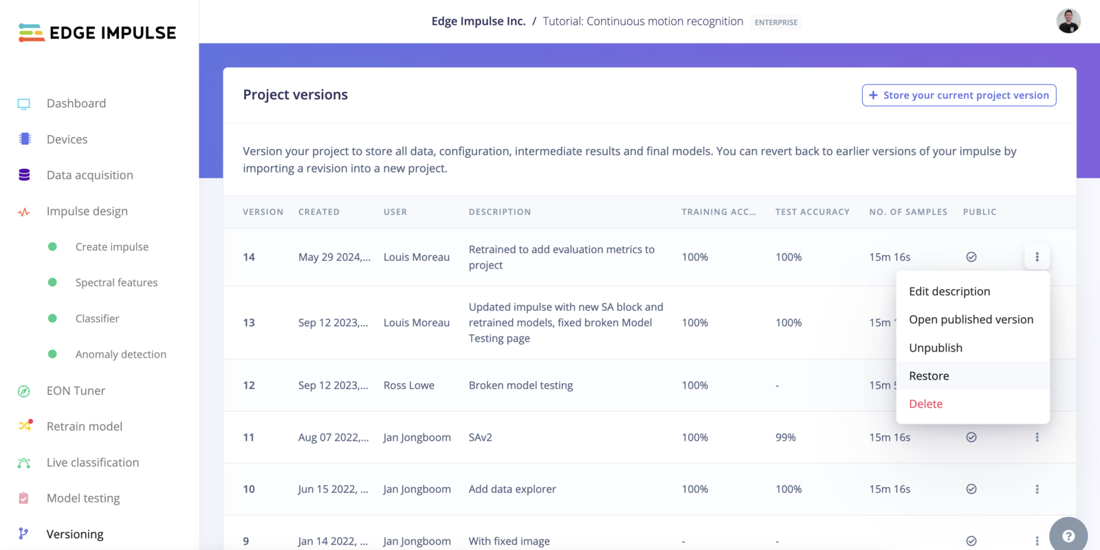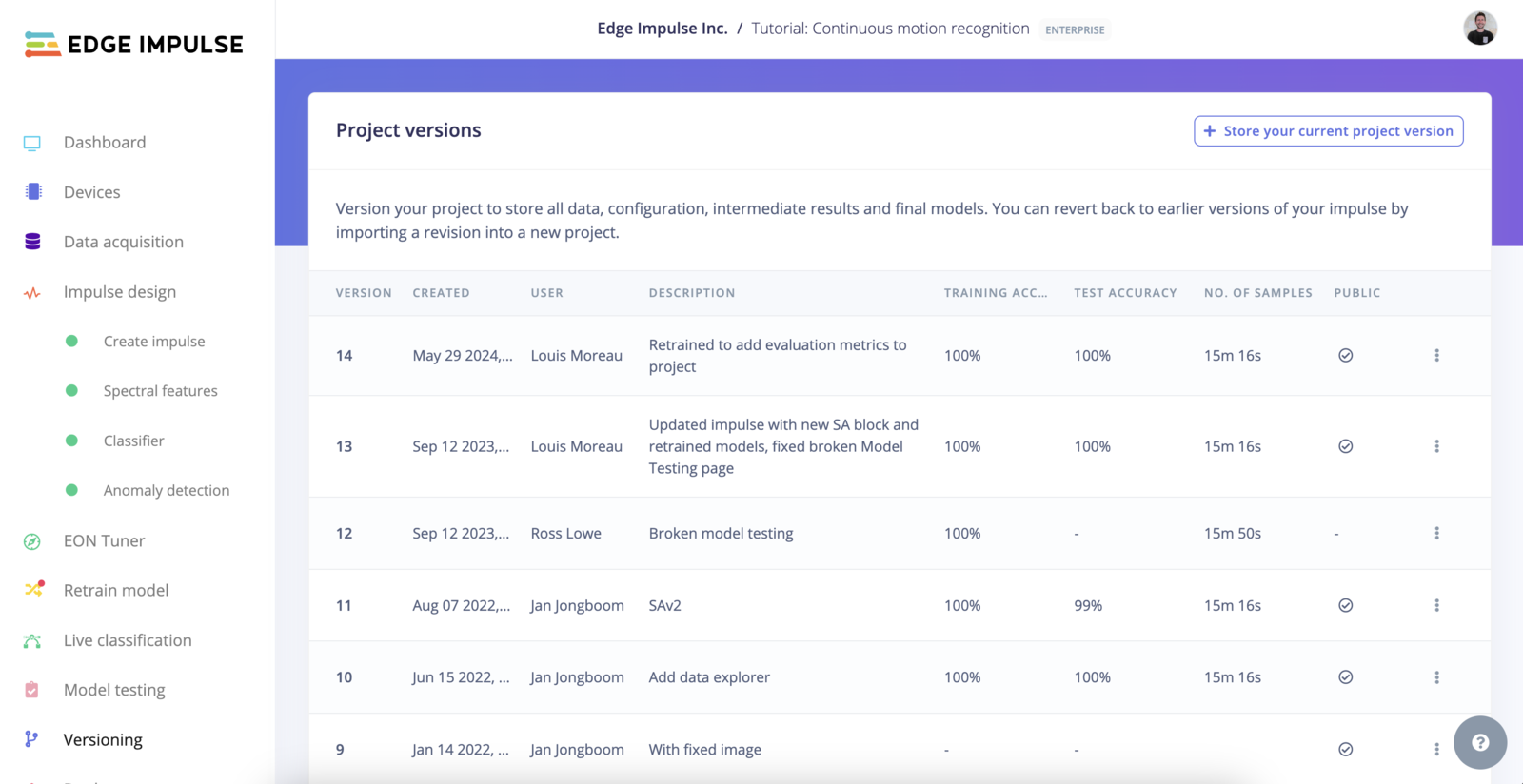 Versioning allows you to create snapshots of your project at different stages of development. This feature is particularly useful for managing complex machine learning projects, where tracking changes and maintaining a history of modifications is essential. Similar to how Git manages different versions of code, Edge Impulse’s versioning system helps manage the evolution of your machine learning projects.Key Benefits