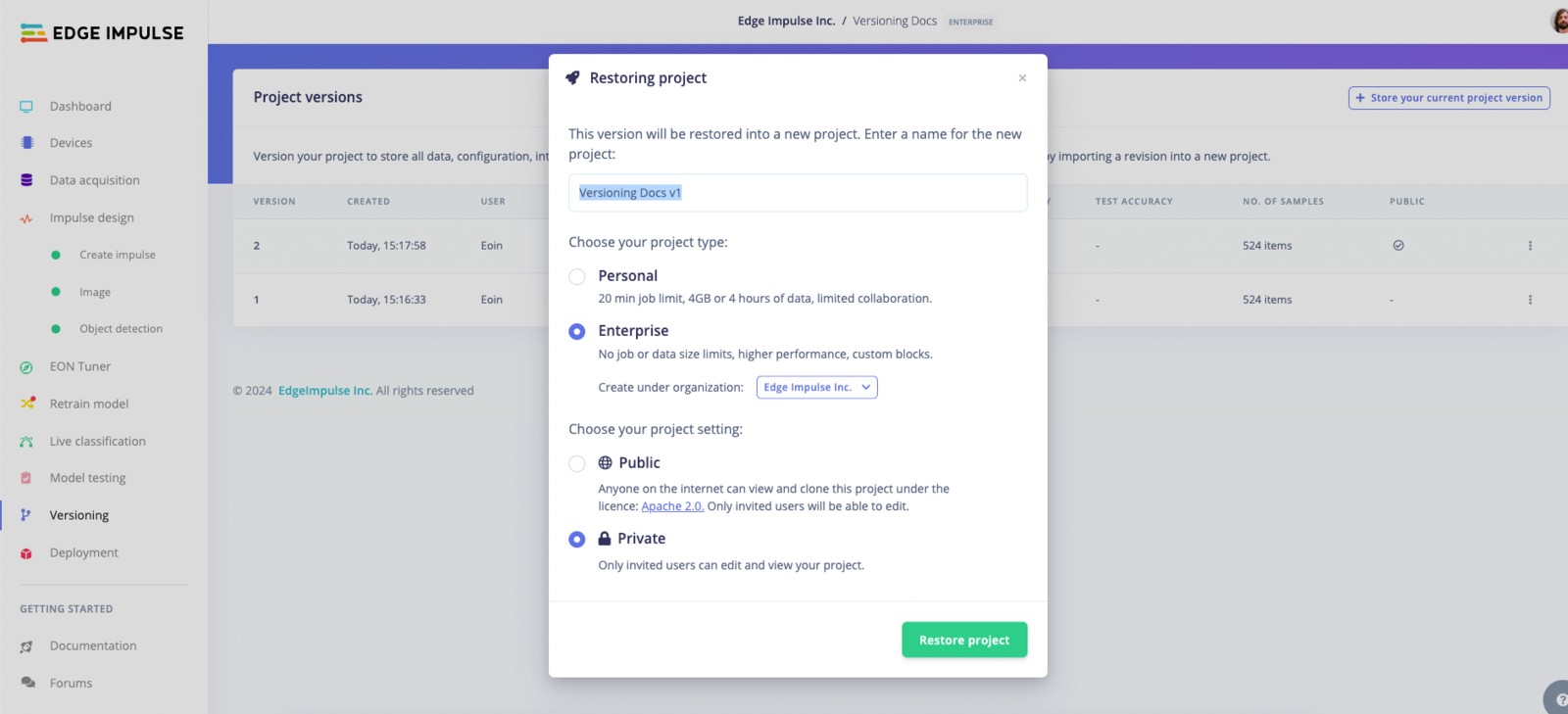 If you want to reference your project in the Edge Impulse public project repository, check the Publish this version under the Apache 2.0 license. This is a great way to share your work with the community.