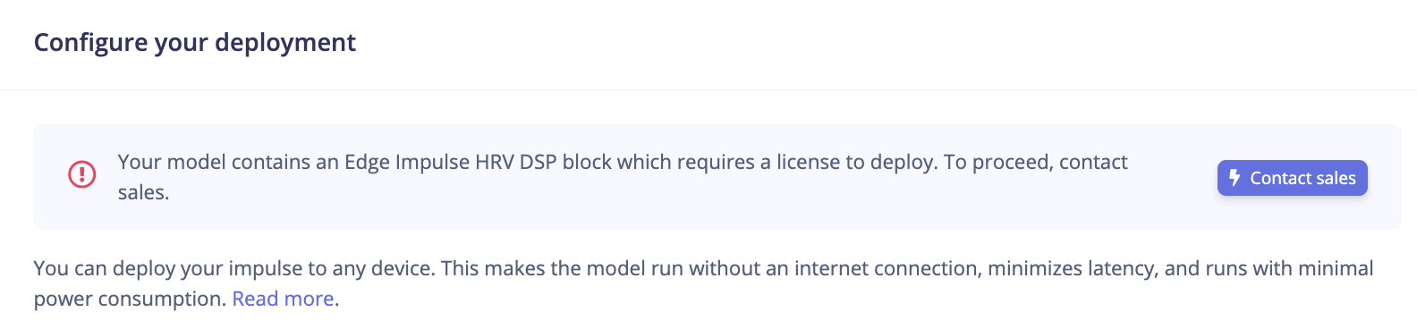 Evaluation available for everyone, deployment only available to Enterprise planAll users (developer and enterprise) can extract HR/HRV features using this processing block for testing purposes. However, the deployment option is only available for Enterprise users. Contact your Solution Engineer to enable it.