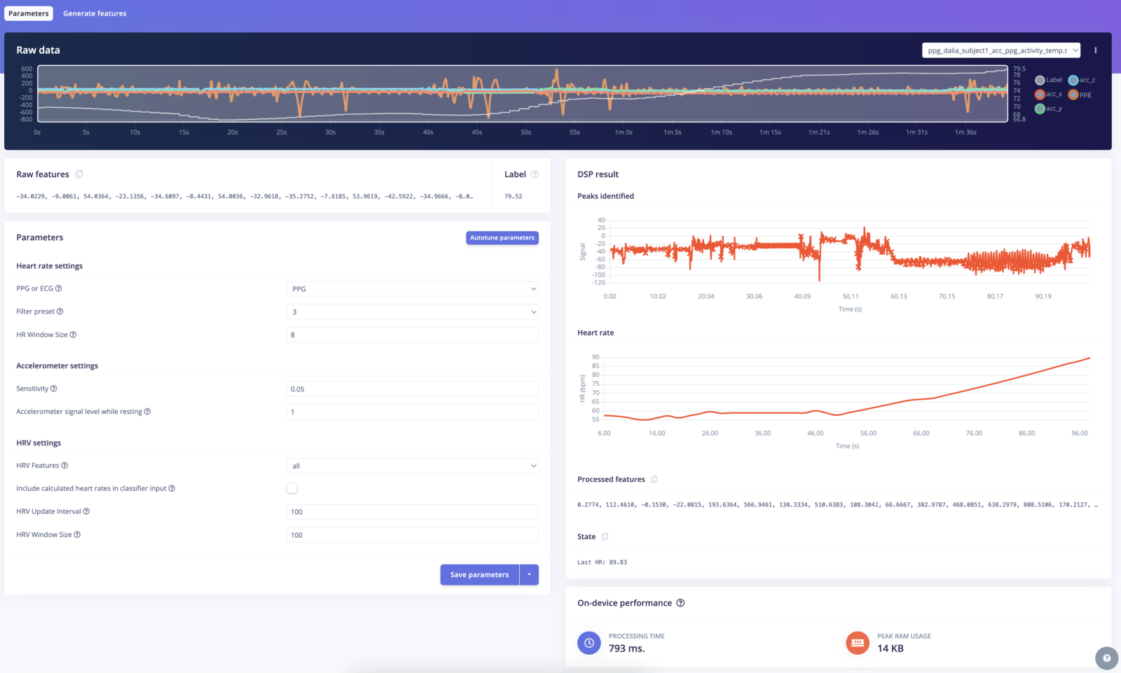 - Edge Impulse will generate the features for both heart rate and HRV over the specified window size.